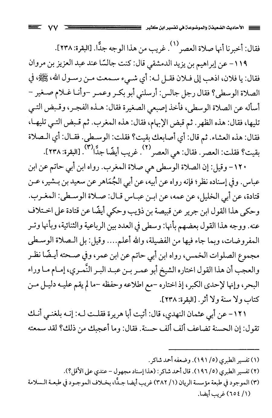 فقال: أخبرنا أنها صلاة العصر. (¬1) غريب من هذا الوجه جدًا. (البقرة: 238) ... 119 - عن إبراهيم بن يزيد الدمشقي قال: كنت جالسًا عند عبد العزيز بن مروان فقال: يا فلان، اذهب إلى فلان فقل له: أي شيء سمعت من رسول الله، صَلَّى اللَّهُ عَلَيْهِ وَسَلَّمَ، في الصلاة الوسطى؟ فقال رجل جالس: أرسلني أبو بكر وعمر - وأنا غلام صغير - أسأله عن الصلاة الوسطى، فأخذ إصبعي الصغيرة فقال: هذه الفجر، وقبض التي تليها، فقال: هذه الظهر. ثم قبض الإبهام، فقال: هذه المغرب. ثم قبض التي تليها، فقال: هذه العشاء. ثم قال: أي أصابعك بقيت؟ فقلت: الوسطى. فقال: أي الصلاة بقيت؟ فقلت: العصر. فقال: هي العصر. (¬2) غريب أيضًا جدًا (¬3). (البقرة: 238)