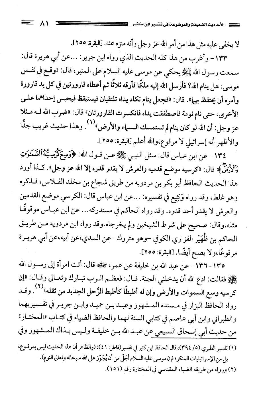 134 - عن ابن عباس قال: سئل النبي صَلَّى اللَّهُ عَلَيْهِ وَسَلَّمَ عن قول الله: {وَسِعَ كُرْسِيُّهُ السَّمَاوَاتِ وَالأرْضَ} قال: "كرسيه موضع قدميه والعرش لا يقدر قدره إلا الله عز وجل".