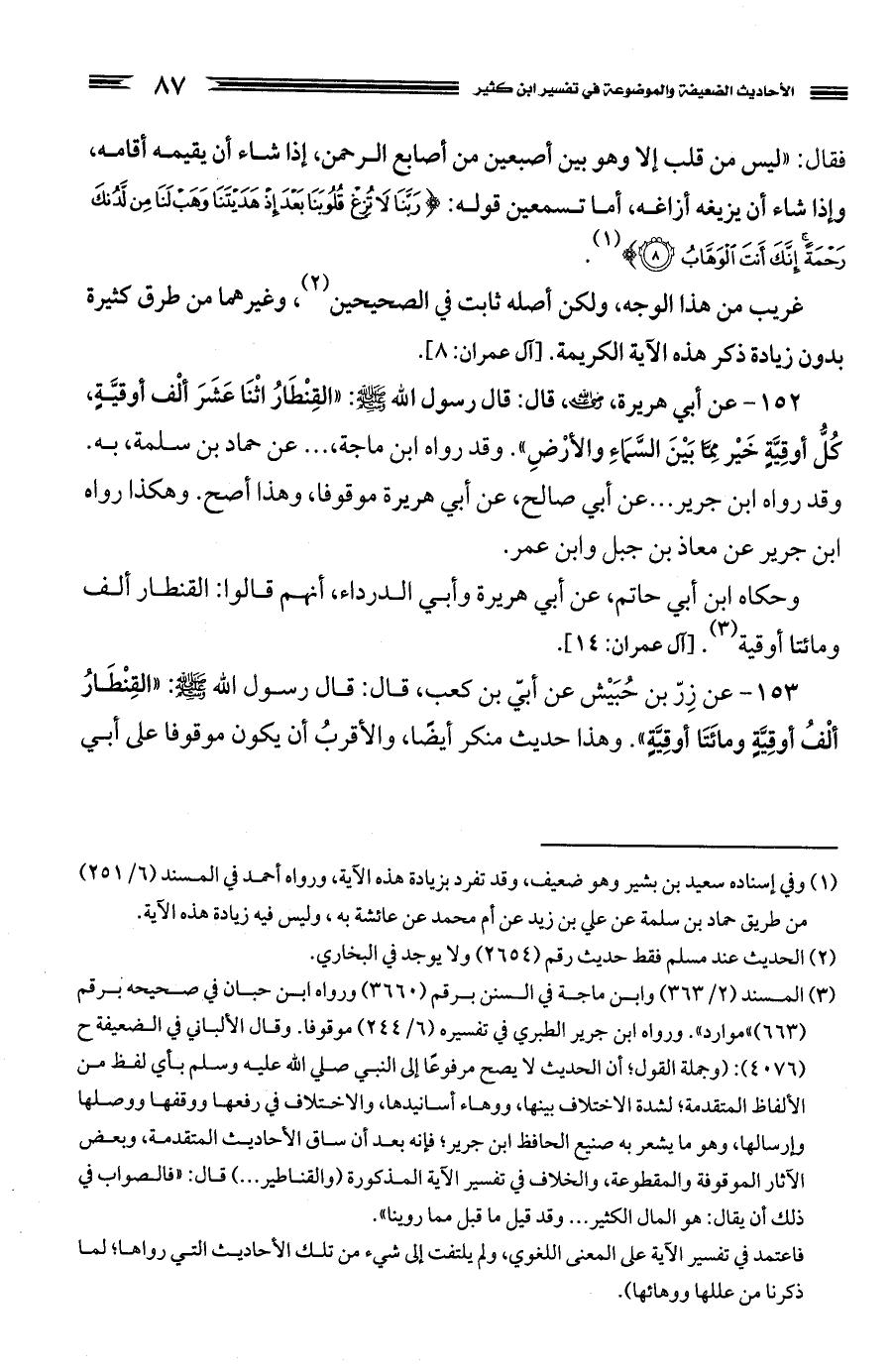 (¬3) المسند (2/ 363) وابن ماجة في السنن برقم (3660) ورواه ابن حبان في صحيحه برقم (663) "موارد". ورواه ابن جرير الطبري في تفسيره (6/ 244) موقوفا. وقال الألباني في الضعيفةح (4076): (وجملة القول؛ أن الحديث لا يصح مرفوعاً إلى النبي صلي الله عليه وسلم بأي لفظ من الألفاظ المتقدمة؛ لشدة الاختلاف بينها، ووهاء أسانيدها، والاختلاف في رفعها ووقفها ووصلها وإرسالها، وهو ما يشعر به صنيع الحافظ ابن جرير؛ فإنه بعد أن ساق الأحاديث المتقدمة، وبعض الآثار الموقوفة والمقطوعة، والخلاف في تفسير الآية المذكورة (والقناطير ...) قال: "فالصواب في ذلك أن يقال: هو المال الكثير ... وقد قيل ما قبل مما روينا".