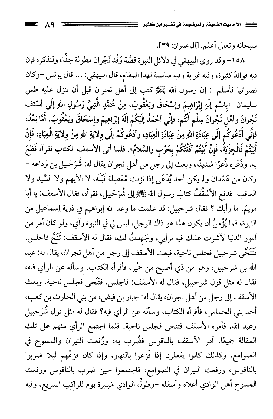 158 - وقد روى البيهقي في دلائل النبوة قصَّة وَفْد نَجْران مطولة جدًا، ولنذكره فإن فيه فوائدَ كثيرة، وفيه غرابة وفيه مناسبة لهذا المقام، قال البيهقي: