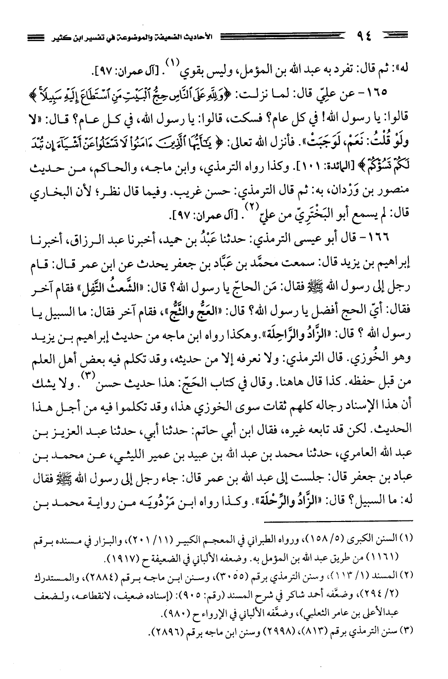 165 - عن علِيّ قال: لما نزلت: {وَلِلَّهِ عَلَى النَّاسِ حِجُّ الْبَيْتِ مَنِ اسْتَطَاعَ إِلَيْهِ سَبِيلا} قالوا: يا رسول الله، في كل عام؟ فسكت، قالوا: يا رسول الله، في كل عام؟ قال: "لا ولَوْ قُلْتُ: نَعَمْ، لَوَجَبَتْ". فأنزل الله تعالى: {يَا أَيُّهَا الَّذِينَ آمَنُوا لا تَسْأَلُوا عَنْ أَشْيَاءَ إِنْ تُبْدَ لَكُمْ تَسُؤْكُمْ} [المائدة: 101]. وكذا رواه الترمذي، وابن ماجة، والحاكم، من حديث منصور بن وَرْدان، به: ثم قال الترمذي: حسن غريب. وفيما قال نظر؛ لأن البخاري قال: لم يسمع أبو البَخْتَرِيّ من عليّ. (¬2) (آل عمران: 97)