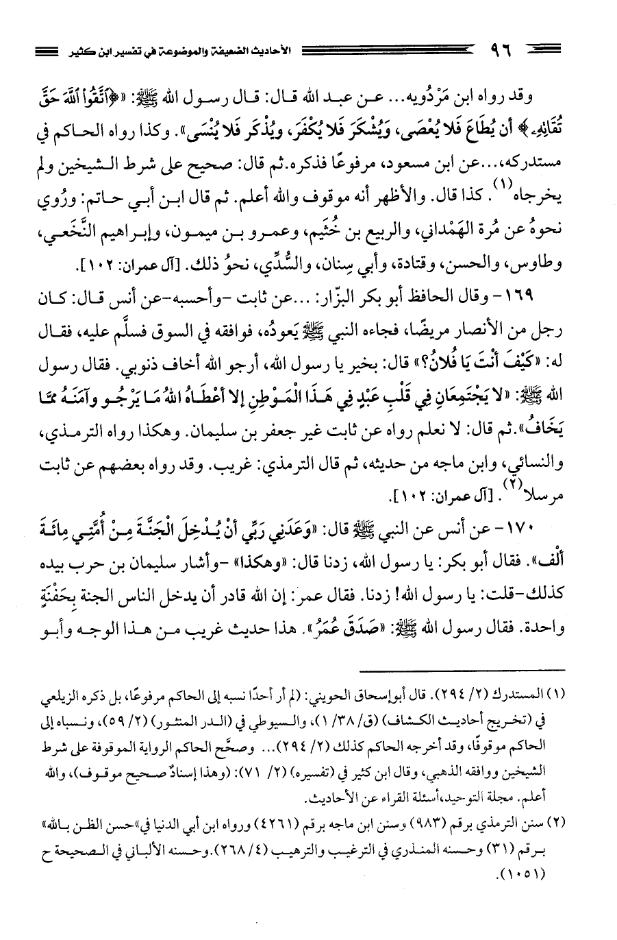 169 - وقال الحافظ أبو بكر البزّار: ... عن ثابت - وأحسبه - عن أنس قال: كان رجل من الأنصار مريضًا، فجاءه النبي صَلَّى اللَّهُ عَلَيْهِ وَسَلَّمَ يَعودُه، فوافقه في السوق فسلَّم عليه، فقال له: "كَيْفَ أنْتَ يَا فُلانُ؟ " قال بخير يا رسول الله، أرجو الله أخاف ذنوبي. فقال رسول الله صَلَّى اللَّهُ عَلَيْهِ وَسَلَّمَ: "لا يَجْتَمِعَانِ فِي قَلْبِ عَبْدٍ فِي هَذَا الْمَوْطِنِ إلا أعْطَاهُ اللهُ مَا يَرْجُو وآمَنَهُ ممَّا يَخَافُ".ثم قال: لا نعلم رواه عن ثابت غير جعفر بن سليمان. وهكذا رواه الترمذي، والنسائي، وابن ماجة من حديثه، ثم قال الترمذي: غريب. وقد رواه بعضهم عن ثابت مرسلا. (¬2) (آل عمران: 102)