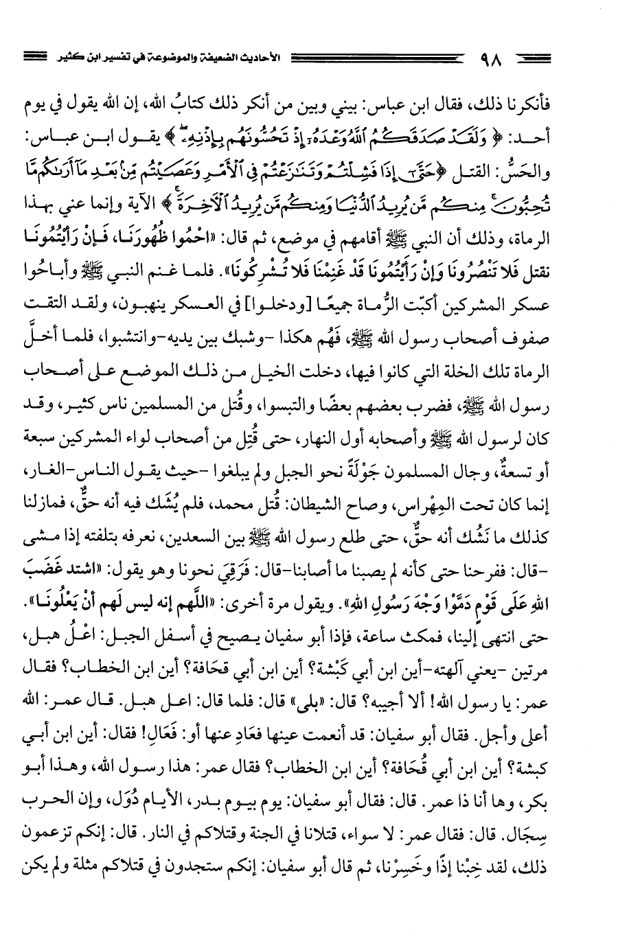 فأنكرنا ذلك، فقال ابن عباس: بيني وبين من أنكر ذلك كتابُ الله، إن الله يقول في يوم أحد: {وَلَقَدْ صَدَقَكُمُ اللَّهُ وَعْدَهُ إِذْ تَحُسُّونَهُمْ بِإِذْنِهِ} يقول ابن عباس: والحَسُّ: القتل {حَتَّى إِذَا فَشِلْتُمْ وَتَنَازَعْتُمْ فِي الأمْرِ وَعَصَيْتُمْ مِنْ بَعْدِ مَا أَرَاكُمْ مَا تُحِبُّونَ مِنْكُمْ مَنْ يُرِيدُ الدُّنْيَا وَمِنْكُمْ مَنْ يُرِيدُ الآخِرَةَ} الآية وإنما عنى بهذا الرماة، وذلك أن النبي صَلَّى اللَّهُ عَلَيْهِ وَسَلَّمَ أقامهم في موضع، ثم قال: "احْمُوا ظُهُورَنَا، فَإنْ رَأيْتُمُونَا نقتل فَلا تَنْصُرُونَا وَإنْ رَأَيْتُمُونَا قَدْ غَنِمْنَا فَلا تُشْرِكُونَا. فلما غنم النبي صَلَّى اللَّهُ عَلَيْهِ وَسَلَّمَ وأباحُوا عسكر المشركين أكبّت الرُّماة جميعا [ودخلوا] في العسكر ينهبون، ولقد التقت صفوف أصحاب رسول الله صَلَّى اللَّهُ عَلَيْهِ وَسَلَّمَ، فَهُم هكذا - وشبك بين يديه - وانتشبوا، فلما أخل الرماة تلك الخلة التي كانوا فيها، دخلت الخيل من ذلك الموضع على أصحاب رسول الله صَلَّى اللَّهُ عَلَيْهِ وَسَلَّمَ، فضرب بعضهم بعضا والتبسوا، وقُتل من المسلمين ناس كثير، وقد كان لرسول الله صَلَّى اللَّهُ عَلَيْهِ وَسَلَّمَ وأصحابه أول النهار، حتى قُتِل من أصحاب لواء المشركين سبعة أو تسعةٌ، وجال المسلمون جَوْلَةً نحو الجبل ولم يبلغوا - حيث يقول الناس - الغار، إنما كان تحت المِهْراس، وصاح الشيطان: قُتل محمد، فلم يُشَك فيه أنه حق، فما زلنا كذلك ما نَشُك أنه حق، حتى طلع رسول الله صَلَّى اللَّهُ عَلَيْهِ وَسَلَّمَ بين السعدين، نعرفه بتلفته إذا مشى - قال: ففرحنا حتى كأنه لم يصبنا ما أصابنا - قال: فَرَقِيَ نحونا وهو يقول: "اشتد غَضَبَ اللهِ عَلَى قَوْمٍ دَمَّوْا وَجْهَ رَسُولِ اللهِ". ويقول مرة أخرى: "اللَّهم إنه ليس لَهم أنْ يَعْلُونَا".