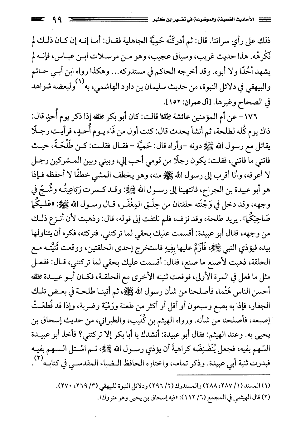 176 - عن أم المؤمنين عائشة، رضي الله عنها، قالت: كان أبو بكر، رضي الله عنه، إذا ذكر يوم أحد قال ذاك يوم كُله لطلحة، ثم أنشأ يحدث قال: كنت أول من فَاء يوم أحد، فرأيت رجلا يقاتل مع رسول الله صَلَّى اللَّهُ عَلَيْهِ وَسَلَّمَ دونه - وأراه قال: حَميَّة فقال فقلت: كن طَلْحَةَ، حيث فاتني ما فاتني، فقلت: يكون رجلا من قومي أحب إلي، وبيني وبين المشركين رجل لا أعرفه، وأنا أقرب إلى رسول الله صَلَّى اللَّهُ عَلَيْهِ وَسَلَّمَ منه، وهو يخطف المشي خطفا لا أحفظه فإذا هو أبو عبيدة بن الجراح، فانتهينا إلى رسول الله صَلَّى اللَّهُ عَلَيْهِ وَسَلَّمَ: وقد كسرت رَبَاعِيتُه وشُجّ في وجهه، وقد دخل في وَجْنَته حلقتان من حِلَق المِغْفَر، قال رسول الله صَلَّى اللَّهُ عَلَيْهِ وَسَلَّمَ: "عَليكُما صَاحِبَكُما". يريد طلحة، وقد نزف، فلم نلتفت إلى قوله، قال: وذهبت لأن أنزع ذلك من وجهه، فقال أبو عبيدة: أقسمت عليك بحقي لما تركتني. فتركته، فكره أن يتناولها بيده فيؤذي النبي صَلَّى اللَّهُ عَلَيْهِ وَسَلَّمَ، فَأزَمَّ عليها بِفِيهِ فاستخرج إحدى الحلقتين، ووقعت ثَنيَّته مع الحلقة، ذهبت لأصنع ما صنع، فقال: أقسمت عليك بحقي لما تركتني، قال: ففعل مثل ما فعل في المرة الأولى، فوقعت ثنيته الأخرى مع الحلقة، فكان أبو عبيدة، رضي الله عنه، أحسن الناس هَتْما، فأصلحنا من شأن رسول الله صَلَّى اللَّهُ عَلَيْهِ وَسَلَّمَ، ثم أتينا طلحة في بعض تلك الجفار، فإذا به بضع وسبعون أو أقل أو أكثر من طعنة ورَمْيَة وضربة، وإذا قد قُطعَتْ إصبعه، فأصلحنا من شأنه.
