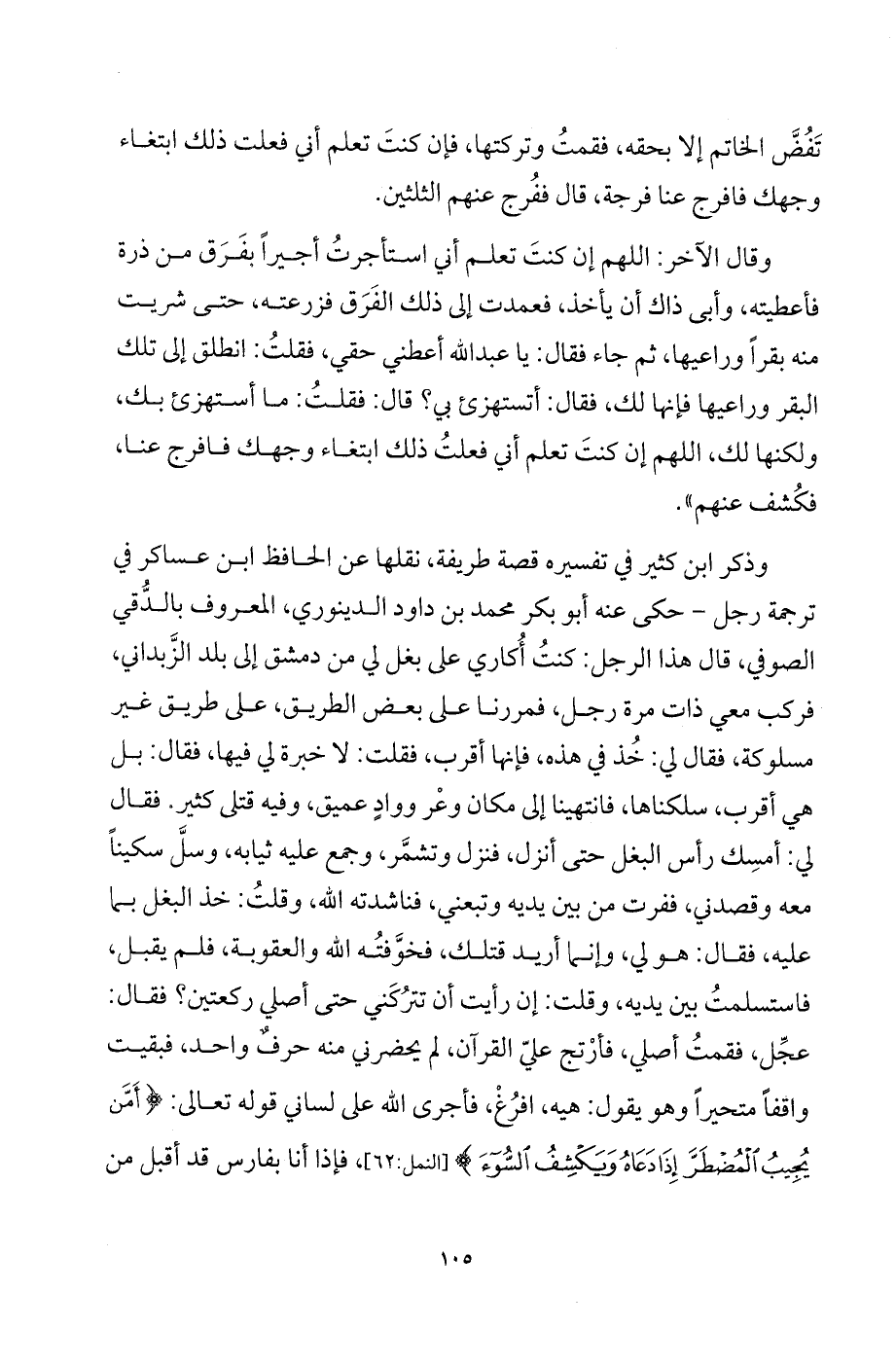وذكر ابن كثير في تفسيره قصة طريفة، نقلها عن الحافظ ابن عساكر في ترجمة رجل - حكى عنه أبو بكر محمد بن داود الدينوري، المعروف بالدُّقي الصوفي، قال هذا الرجل: كنت أكاري على بغل لي من دمشق إلى بلد الزَّبداني، فركب معي ذات مرة رجل، فمررنا على بعض الطريق، على طريق غير مسلوكة، فقال لي: خذ في هذه، فإنها أقرب، فقلت: لا خبرة لي فيها، فقال: بل هي أقرب، سلكناها، فانتهينا إلى مكان وعر ووادٍ عميق، وفيه قتلى كثير. فقال لي: أمسك رأس البغل حتى أنزل، فنزل وتشمَّر، وجمع عليه ثيابه، وسلَّ سكيناً معه وقصدني، ففرت من بين يديه وتبعني، فناشدته الله، وقلت: خذ البغل بما عليه، فقال: هو لي، وإنما أريد قتلك، فخوَّفته الله والعقوبة، فلم يقبل، فاستسلمت بين يديه، وقلت: إن رأيت أن تتركني حتى أصلي ركعتين؟ فقال: عجِّل، فقمت أصلي، فأرتج عليّ القرآن، لم يحضرني منه حرف واحد، فبقيت واقفاً متحيراً وهو يقول: هيه، افرغ، فأجرى الله على لساني قوله تعالى: {أَمَّنْ يُجِيبُ الْمُضطَرَّ إِذَا دَعَاهُ وَيَكْشِفُ السُّوءَ} [النمل: 62]، فإذا أنا بفارس قد أقبل من