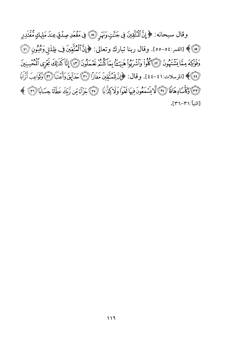 وقال سبحانه: {إِنَّ الْمُتَّقِينَ فِي جَنَّاتٍ وَنَهَرٍ * فِي مَقْعَدِ صِدْقٍ عِنْدَ مَلِيكٍ مُّقْتَدِرٍ} [القمر: 54 - 55]. وقال ربنا تبارك وتعالى: {إِنَّ الْمُتَّقِينَ فِي ظِلالٍ وَعُيُونٍ * وَفَوَاكِهَ مِمَّا يَشْتَهُونَ * كُلُوا وَاشْرَبُوا هَنِيئَا بِمَا كُنتُمْ تَعْمَلُونَ * إِنَّا كَذَلِكَ نَجْزِي الْمُحْسِنينَ} [المرسلات: 41 - 44]. وقال: {إِنَّ لِلْمُتَّقِينَ مَفَازًا * حَدَائِقَ وَأَعْنَابًا * وَكَوَاعِبَ أَتْرَابًا * وَكَاسًا دِهَاقًا * لا يَسْمَعُونَ فِيهَا لَغْوًا وَلا كِذَّابًا * جَزَاءً مِنْ رَّبِّكَ عَطَاءً حِسَابًا} [النبأ: 31 - 36].