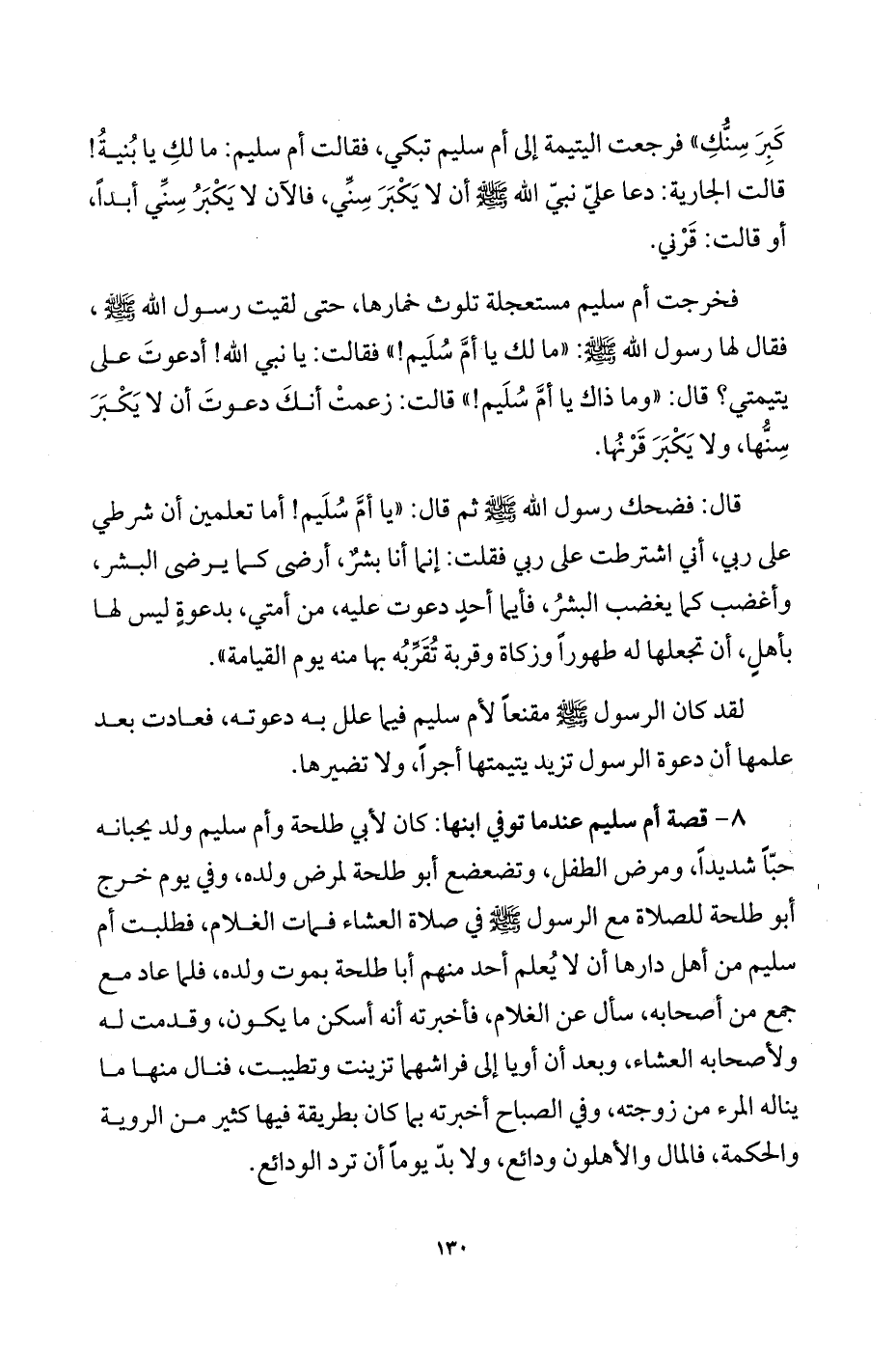 كبر سنُّك» فرجعت اليتيمة إلى أم سليم تبكي، فقالت أم سليم: ما لك يا بنية! قالت الجارية: دعا عليّ نبيّ الله - صلى الله عليه وسلم - أن لا يكبر سنِّي، فالآن لا يكبر سنِّي أبداً، أو قالت: قرني.