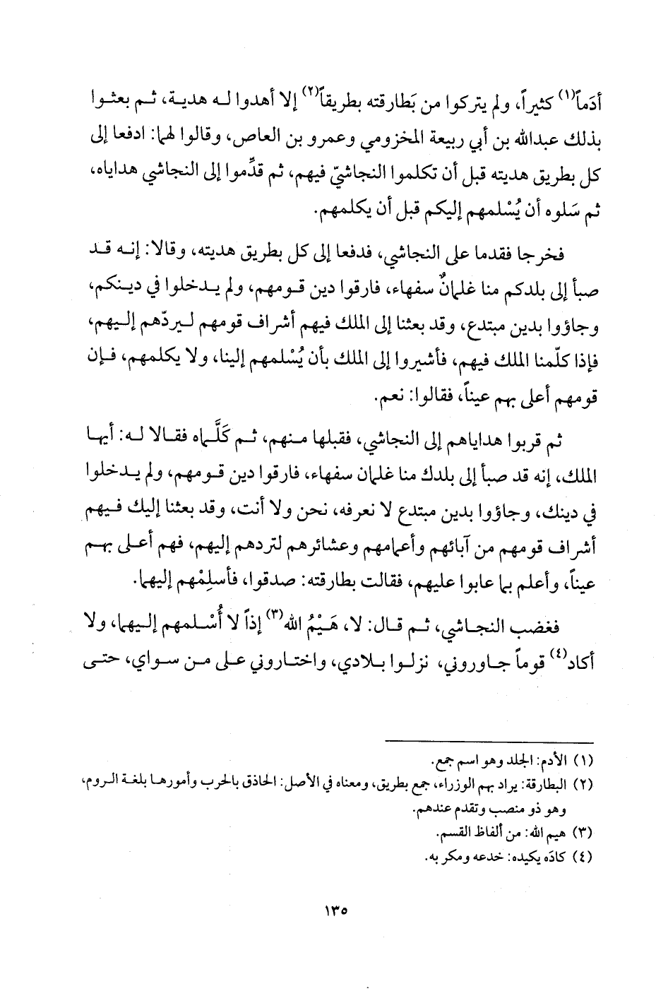 أدماً (¬1) كثيراً، ولم يتركوا من بطارقته بطريقاً (¬2) إلا أهدوا له هدية، ثم بعثوا بذلك عبد الله بن أبي ربيعة المخزومي وعمرو بن العاص، وقالوا لهما: ادفعا إلى كل بطريق هديته قبل أن تكلموا النجاشيّ فيهم، ثم قدِّموا إلى النجاشي هداياه، ثم سلوه أن يسلمهم إليكم قبل أيكلمهم.
