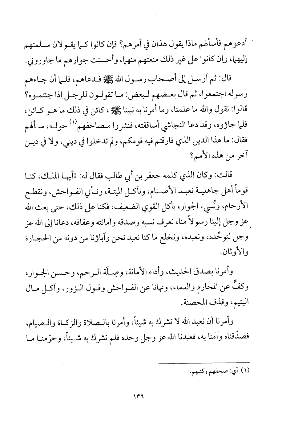 قالت: وكان الذي كلمه جعفر بن أبي طالب فقال له: "أيها الملك، كنا قوماً أهل جاهلية نعبد الأصنام، ونأكل الميتة، ونأتي الفواحش، ونقطع الأرحام، ونسيء الجوار، يأكل القوي الضعيف، فكنا على ذلك، حتى بعث الله عز وجل إلينا رسولاً منا، نعرف نسبه وصدقه وأمانته وعفافه، دعانا إلى الله عز وجل لنوحِّده، ونعبده، ونخلع ما كنا نعبد نحن وآباؤنا من دونه من الحجارة والأوثان.