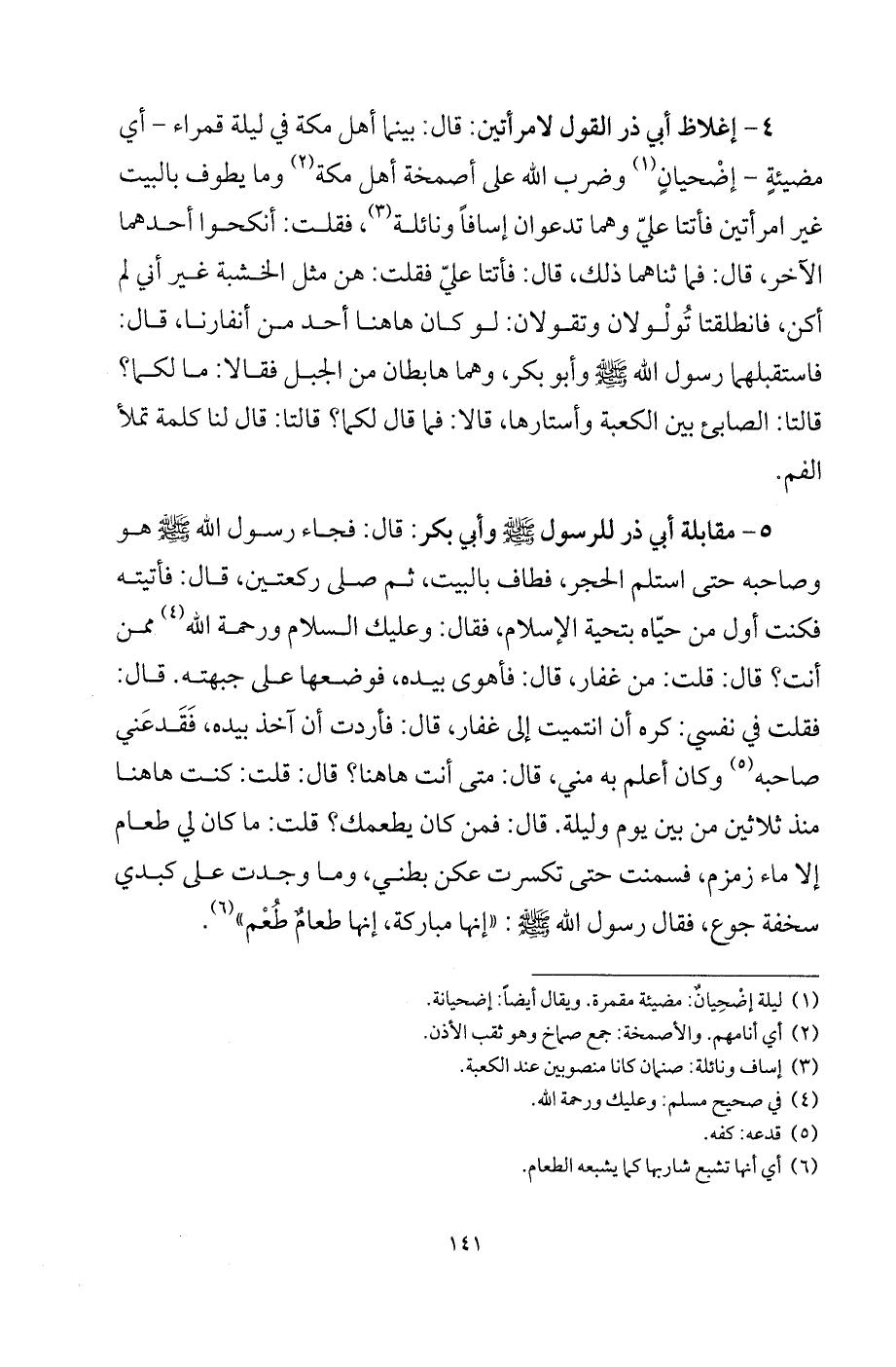4 - إغلاظ أبي ذر القول لامرأتين: قال: بينما أهل مكة في ليلة قمراء - أي مضيئةٍ - إضحيانٍ (¬1) وضرب الله على أصمخة أهل مكة (¬2) وما يطوف بالبيت غير امرأتين فأتتا عليّ وهما تدعوان إسافاً ونائلة (¬3)، فقلت: أنكحوا أحدهما الآخر، قال: فما ثناهما ذلك، قال: فأتتا عليّ فقلت: هن مثل الخشبة غير أني لم أكن، فانطلقتا تولولان وتقولان: لو كان هاهنا أحد من أنفارنا، قال: فاستقبلهما رسول الله - صلى الله عليه وسلم - وأبو بكر، وهما هابطان من الجبل فقالا: ما لكما؟ قالتا: الصابئ بين الكعبة وأستارها، قالا: فما قال لكما؟ قالتا: قال لنا كلمة تملأ الفم.