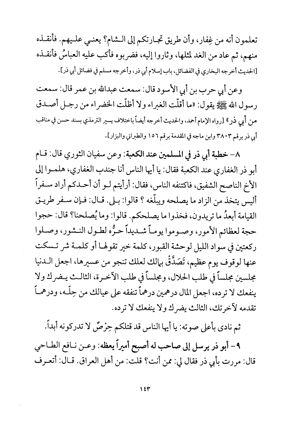 8 - خطبة أبي ذر في المسلمين عند الكعبة: وعن سفيان الثوري قال: قام أبو ذر الغفاري عند الكعبة فقال: يا أيها الناس أنا جندب الغفاري، هلموا إلى الأخ الناصح الشفيق، فاكتنفه الناس، فقال: أرأيتم لو أن أحدكم أراد سفراً أليس يتخذ من الزاد ما يصلحه ويبلّغه؟ قالوا: بلى: قال: فإن سفر طريق القيامة أبعد ما تريدون، فخذوا ما يصلحكم. قالوا: وما يصلحنا؟ قال: حجوا حجة لعظائم الأمور، وصوموا يوماً شديداً حرُّه لطول النشور، وصلوا ركعتين في سواد الليل لوحشة القبور، كلمة خير تقولها أو كلمة شر تسكت عنها لوقوف يوم عظيم، تصدَّق بما لك لعلك تنجو من عسيرها، اجعل الدنيا مجلسين مجلساً في طلب الحلال، ومجلساً في طلب الآخرة، الثالث يضرك ولا ينفعك لا ترده، اجعل المال درهمين درهماً تنفقه على عيالك من حلّه، ودرهماً تقدمه لآخرتك، الثالث يضرك ولا ينفعك لا ترده.