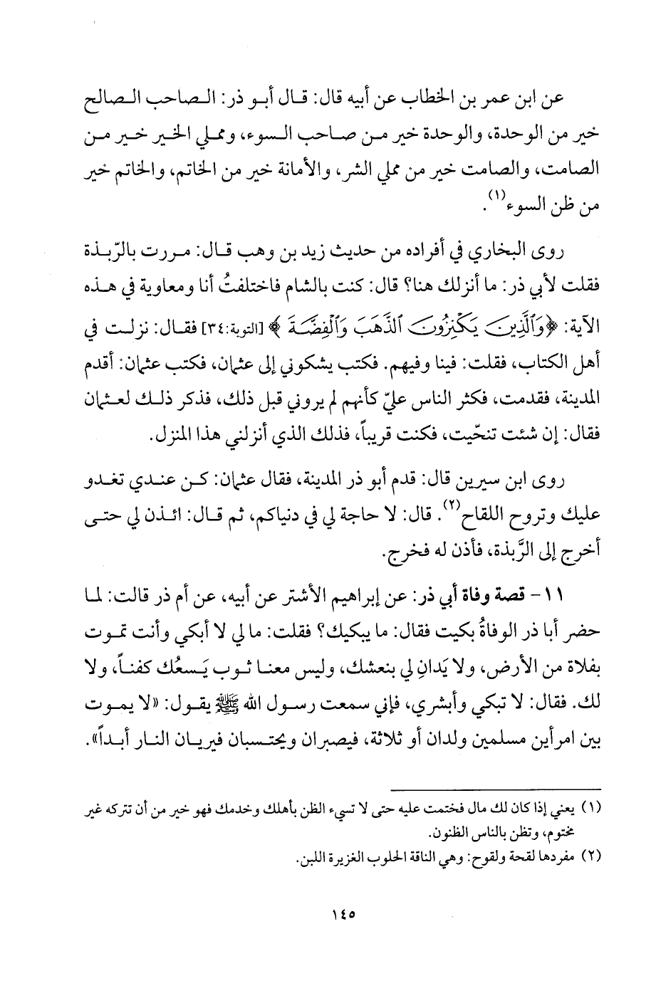 11 - قصة وفاة أبي ذر: عن إبراهيم الأشتر عن أبيه، عن أم ذر قالت: لما حضر أبا ذر الوفاة بكيت فقال: ما يبكيك؟ فقلت: ما لي لا أبكي وأنت تموت بفلاة من الأرض، ولا يدان لي بنعشك، وليس معنا ثوب يسعك كفناً، ولا لك. فقال: لا تبكي وأبشري، فإني سمعت رسول الله - صلى الله عليه وسلم - يقول: «لا يموت بين امرأين مسلمين ولدان أو ثلاثة، فيصبران ويحتسبان فيريان النار أبداً».