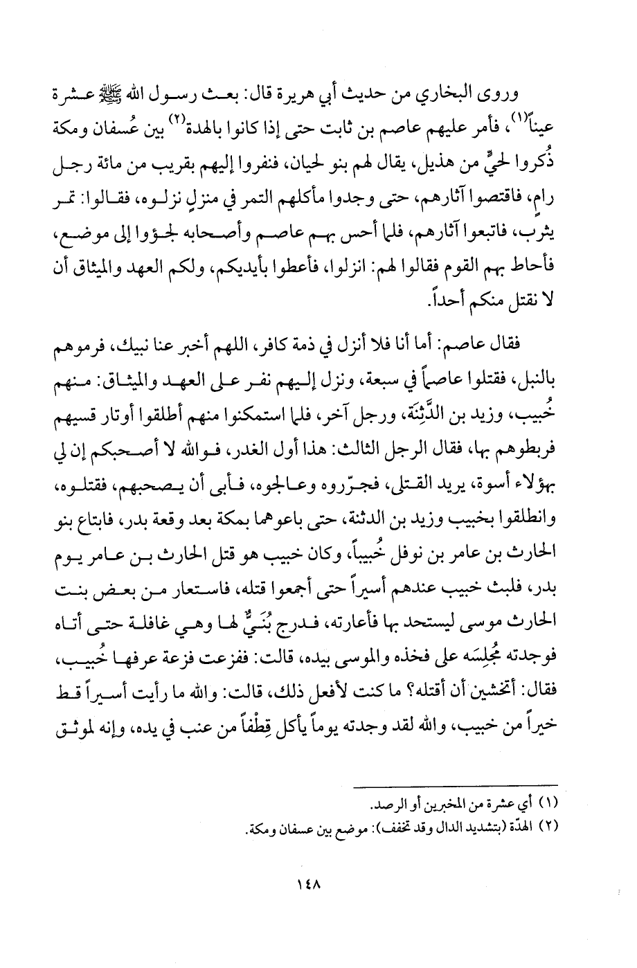 وروى البخاري من حديث أبي هريرة قال: بعث رسول الله - صلى الله عليه وسلم - عشرة عيناً (¬1)، فأمر عليهم عاصم بن ثابت حتى إذا كانوا بالهدة (¬2) بين عسفان ومكة ذكروا لحيٍّ من هذيل، يقال لهم بنو لحيان، فنفروا إليهم بقريب من مائة رجل رامٍ، فاقتصوا آثارهم، حتى وجدوا مأكلهم التمر في منزلٍ نزلوه، فقالوا: تمر يثرب، فاتبعوا آثارهم، فلما أحس بهم عاصم وأصحابه لجؤوا إلى موضع، فأحاط بهم القوم فقالوا لهم: انزلوا، فأعطوا بأيدكم، ولكم العهد والميثاق أن لا نقتل منكم أحداً.