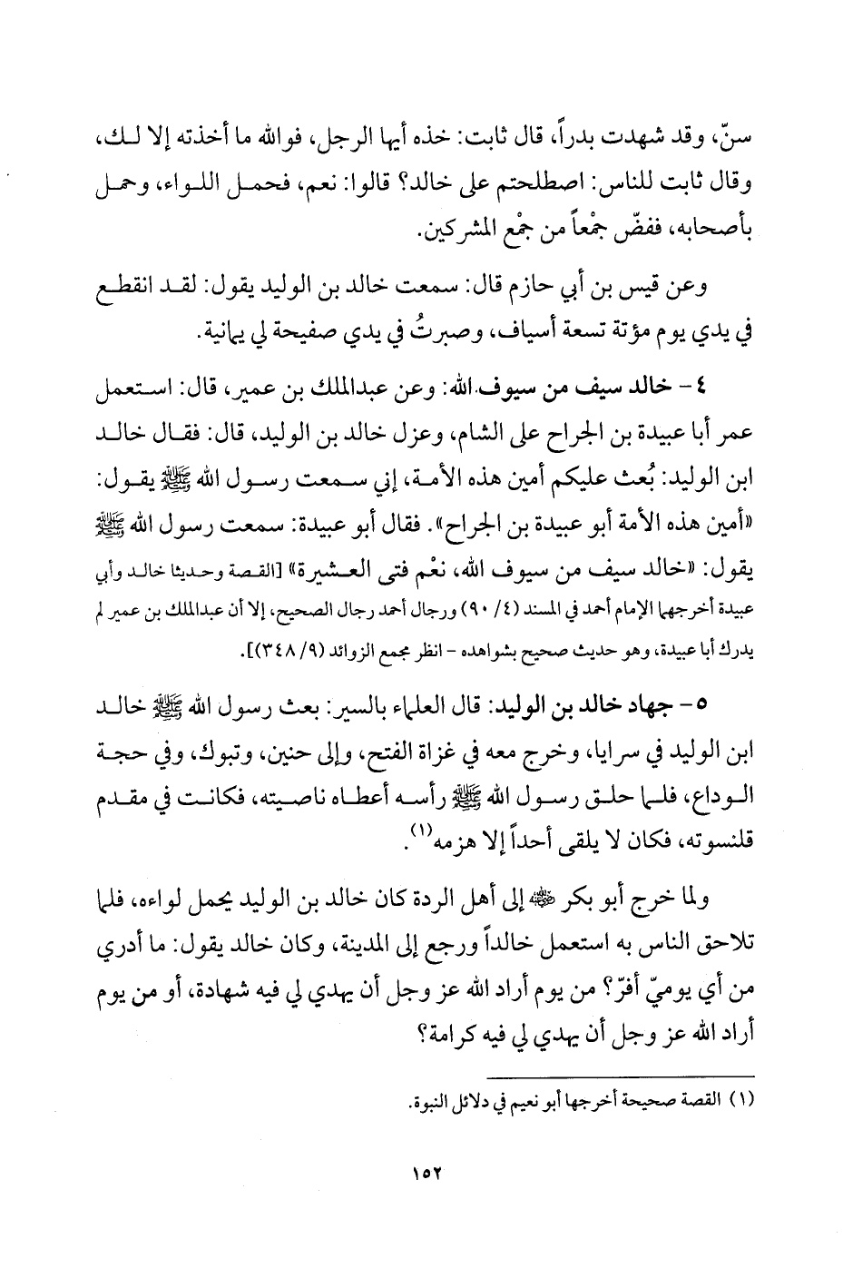 4 - خالد سيف من سيوف الله: وعن عبد الملك بن عمير، قال: استعمل عمر أبا عبيدة بن الجراح على الشام، وعزل خالد بن الوليد، قال: فقال خالد ابن الوليد: بعث عليكم أمين هذه الأمة، إني سمعت رسول الله - صلى الله عليه وسلم - يقول: «أمين هذه الأمة أبو عبيدة بن الجراح». فقال أبو عبيدة: سمعت رسول الله - صلى الله عليه وسلم - يقول: «خالد سيف من سيوف الله، نعم فتى العشيرة» [القصة وحديثا خالد وأبي عبيدة أخرجهما الإمام أحمد في المسند (4/ 90) ورجال أحمد رجال الصحيح، إلا أن عبد الملك بن عمير لم يدرك أبا عبيدة، وهو حديث صحيح بشواهده - انظر مجمع الزوائد (9/ 348)].