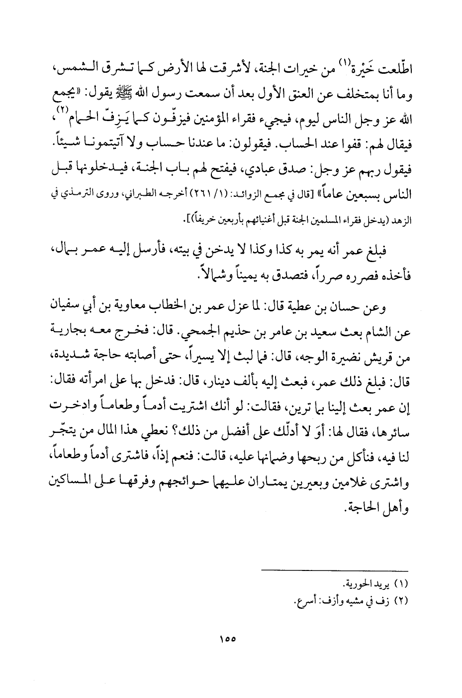 اطّلعت خيرة (¬1) من خيرات الجنة، لأشرقت لها الأرض كما تشرق الشمس، وما أنا بمتخلف عن العنق الأول بعد أن سمعت رسول الله - صلى الله عليه وسلم - يقول: «يجمع الله عز وجل الناس ليوم، فيجيء فقراء المؤمنين فيزفّون كما يزفّ الحمام (¬2)، فيقال لهم: قفوا عند الحساب. فيقولون: ما عندنا حساب ولا آتيتمونا شيئاً، فيقول ربهم عز وجل: صدق عبادي، فيفتح لهم باب الجنة، فيدخلونها قبل الناس بسبعين عاماً» [قال في مجمع الزوائد: (1/ 261) أخرجه الطبراني، وروى الترمذي في الزهد «يدخل فقراء المسلمين الجنة قبل أغنيائهم بأربعين خريفاً»].