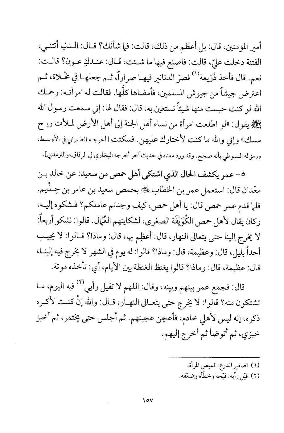 أمير المؤمنين، قال: بل أعظم من ذلك، قالت: فما شأنك؟ قال: الدنيا أتتني، الفتنة دخلت عليّ، قالت: فاصنع فيها ما شئت، قال: عندك عون؟ قالت: نعم. قال فأخذ دريعة (¬1) فصرّ الدنانير فيها صراراً، ثم جعلها في مخلاة، ثم اعترض جيشاً من جيوش المسلمين، فأمضاها كلَّها. فقالت له امرأته: رحمك الله لو كنت حبست منها شيئاً نستعين به، قال: فقال لها: إني سمعت رسول الله - صلى الله عليه وسلم - يقول: «لو اطلعت امرأة من نساء أهل الجنة إلى أهل الأرض لملأت ريح مسك» وإني والله ما كنت لأختارك عليهن. فسكتت [أخرجه الطبراني في الأوسط، ورمز له السيوطي بأنه صحح. وقد ورد معناه في حديث آخر أخرجه البخاري في الرقاق، والترمذي].