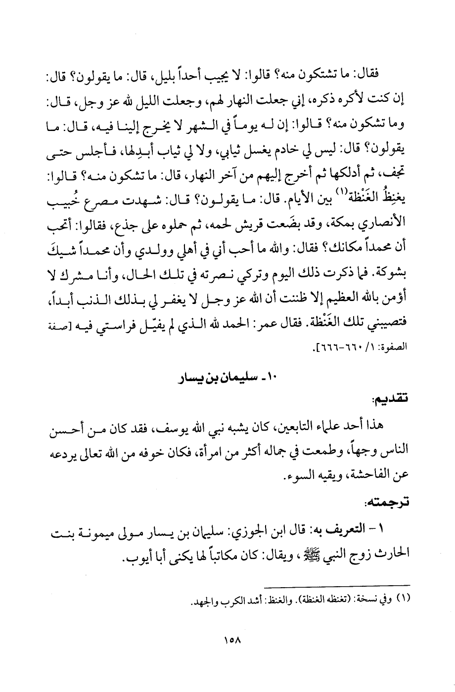 فقال: ما تشتكون منه؟ قالوا: لا يجيب أحداً بليل، قال: ما يقولون؟ قال: إن كنت لأكره ذكره، إني جعلت النهار لهم، وجعلت الليل لله عز وجل، قال: وما تشكون منه؟ قالوا: إن له يوماً في الشهر لا يخرج إلينا فيه، قال: ما يقولون؟ قال: ليس لي خادم يغسل ثيابي، ولا لي ثياب أبدلها، فأجلس حتى تجف، ثم أدلكها ثم أخرج إليهم من آخر النهار، قال: ما تشكون منه؟ قالوا: يغنظ الغنظة (¬1) بين الأيام. قال: ما يقولون؟ قال: شهدت مصرع خبيب الأنصاري بمكة، وقد بضعت قريش لحمه، ثم حملوه على جذع، فقالوا: أتحب أن محمداً مكانك؟ فقال: والله ما أحب أني في أهلي وولدي وأن محمداً شيك بشوكة. فما ذكرت ذلك اليوم وتركي نصرته في تلك الحال، وأنا مشرك لا أؤمن بالله العظيم إلا ظننت أن الله عز وجل لا يغفر لي بذلك الذنب أبداً، فتصيبني تلك الغنظة. فقال عمر: الحمد لله الذي لم يفيّل فراستي فيه [صفة الصفوة: 1/ 660 - 666].