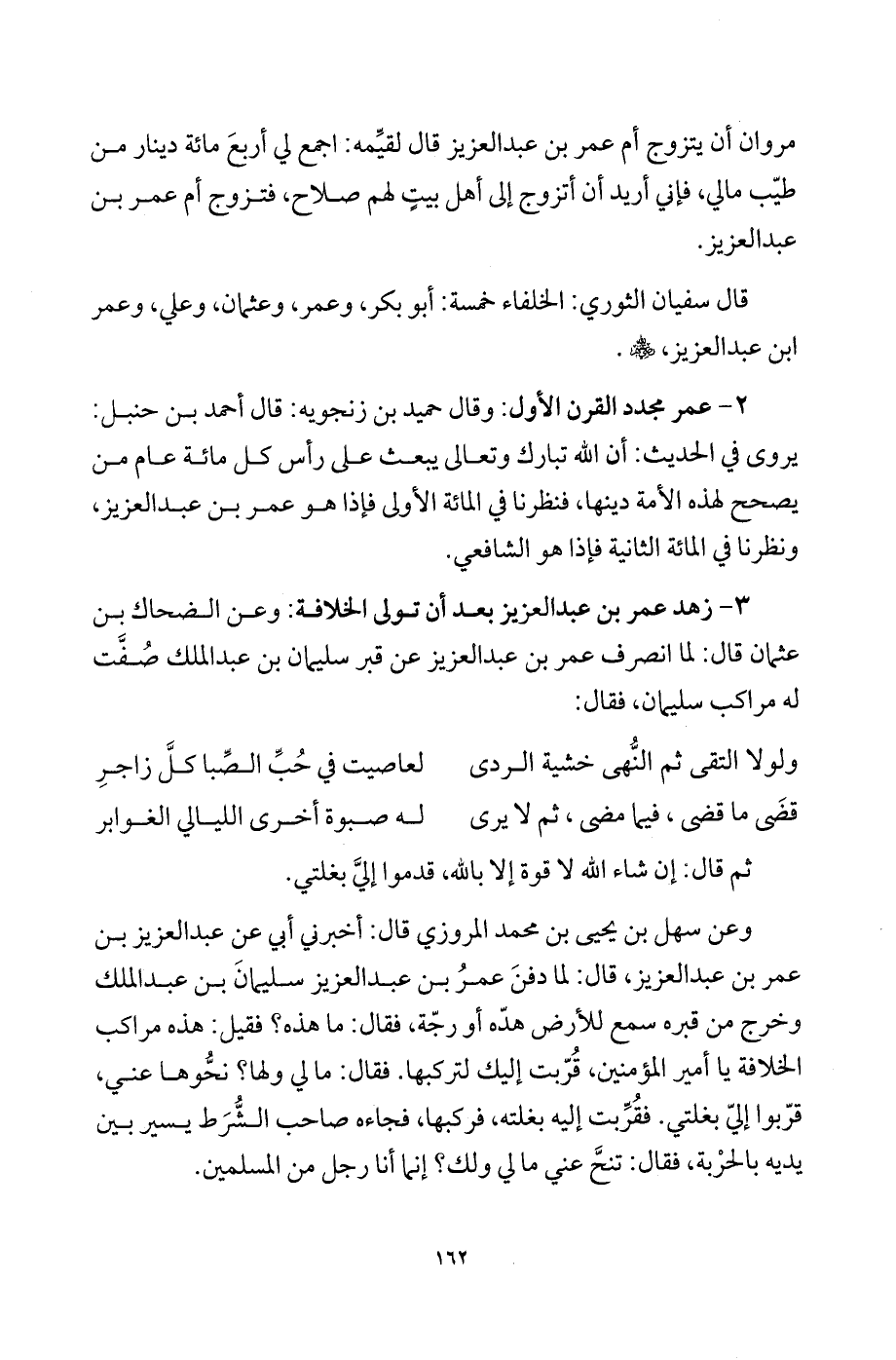 2 - عمر مجدد القرن الأول: وقال حميد بن زنجويه: قال أحمد بن حنبل: يروى في الحديث: أن الله تبارك وتعالى يبعث على رأس كل مائة عام من يصحح لهذه الأمة دينها، فنظرنا في المائة الأولى فإذا هو عمر بن عبد العزيز، ونظرنا في المائة الثانية فإذا هو الشافعي.