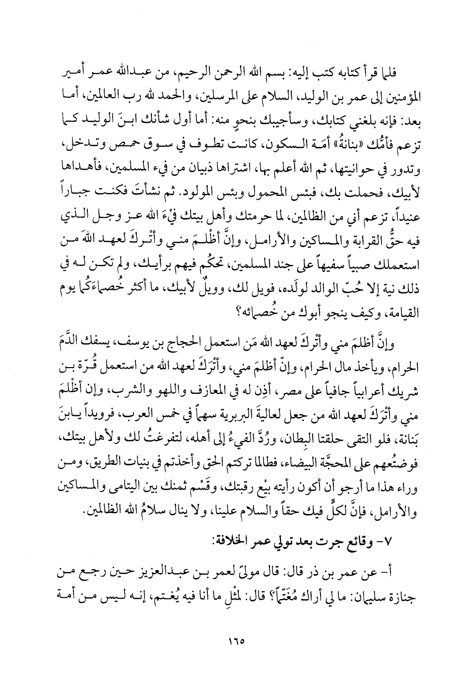 وإنَّ أظلم مني وأترك لعهد الله من استعمل الحجاج بن يوسف، يسفك الدَّم الحرام، ويأخذ مال الحرام، وإنّ أظلم مني، وأترك لعهد الله من استعمل قرّة بن شريك أعرابياً جافياً على مصر، أذن له في المعازف واللهو والشرب، وإن أظلم مني وأترك لعهد الله من جعل لعالية البربرية سهماً في خمس العرب، فرويداً يا بن بنانة، فلو التقى خلقتا البطان، وردَّ الفيء إلى أهله، لتفرغت لك ولأهل بيتك، فوضتعهم على المحجَّة البيضاء، فطالما تركتم الحق وأخذتم في بنيات الطريق، ومن وراء هذا ما أرجو أن أكون رايته بيع رقبتك، وقسم ثمنك بين اليتامى والمساكين والأرامل، فإنَّ لكلٍّ فيك حقاً والسلام علينا، ولا ينال سلام الله الظالمين.