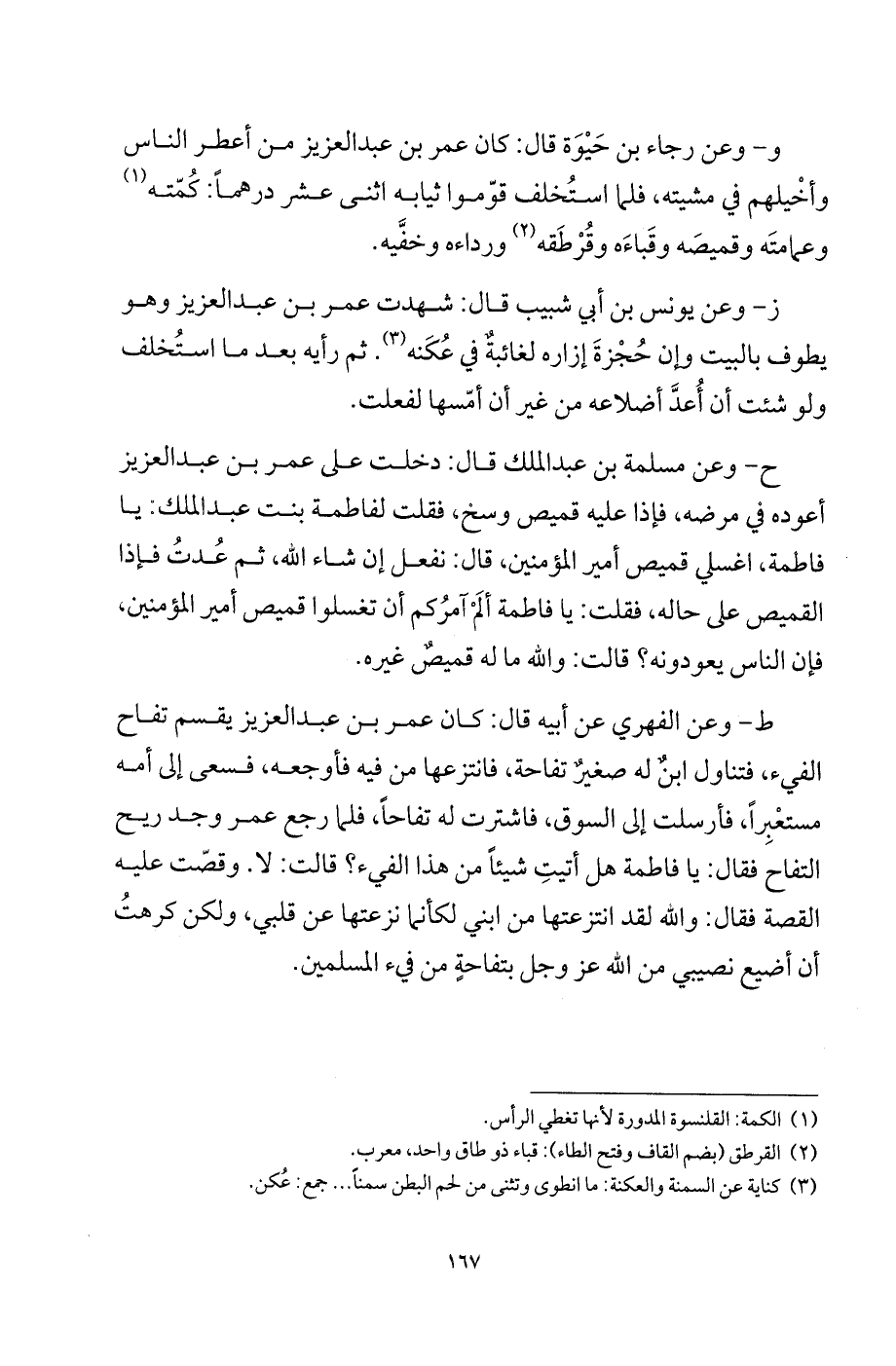 ح - وعن مسلمة بن عبد الملك قال: دخلت على عمر بن عبد العزيز أعوده في مرضه، فإذا عليه قميص وسخ، فقلت لفاطمة بنت عبد الملك: يا فاطمة، اغسلي قميص أمير المؤمنين، قال: نفعل إن شاء الله، ثم عدت فإذا القميص على حاله، فقلت: يا فاطمة ألم آمركم أن تغسلوا قميص أمير المؤمنين، فإن الناس يعودونه؟ قالت: والله ماله قميصٌ غيره.