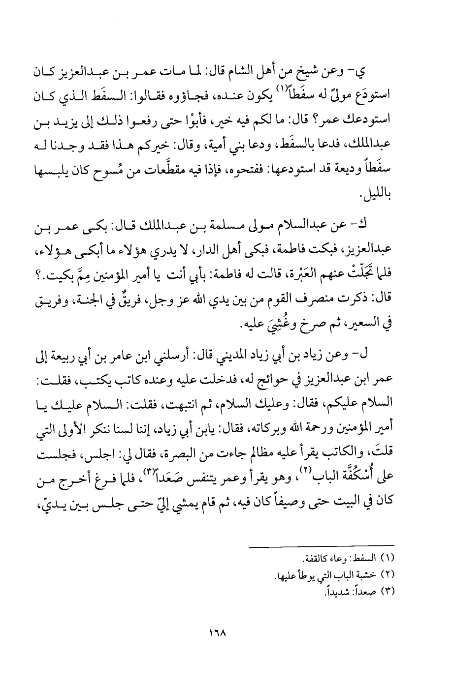 ك - عن عبد السلام مولى مسلمة بن عبد الملك قال: بكى عمر بن عبد العزيز، فبكت فاطمة، فبكى أهل الدار، لا يدري هؤلاء ما أبكى هؤلاء، فلما تجلّت عنهم العبرة، قالت له فاطمة: بأبي أنت يا أمير المؤمنين ممَّ بكيت.؟ قال: ذكرت منصرف القوم من بين يدي الله عز وجل، فريقٌ في الجنة، وفريق في السعير، ثم صرخ وغشي عليه.