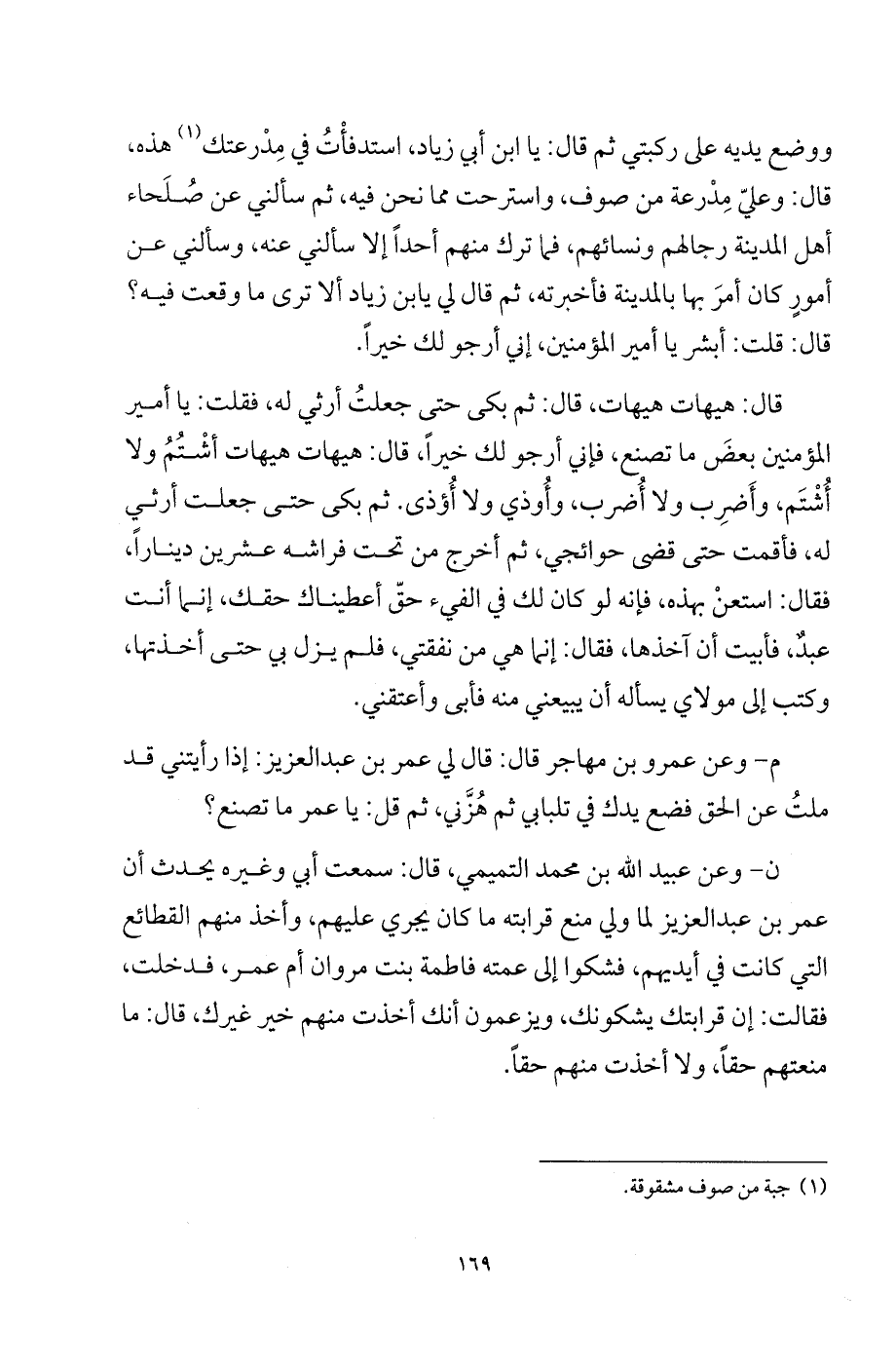 م - وعن عمرو بن مهاجر قال: قال لي عمر بن عبد العزيز: إذا رأيتني قد ملت عن الحق فضع يدك في تلبابي ثم هزَّني، ثم قل: يا عمر ما تصنع؟