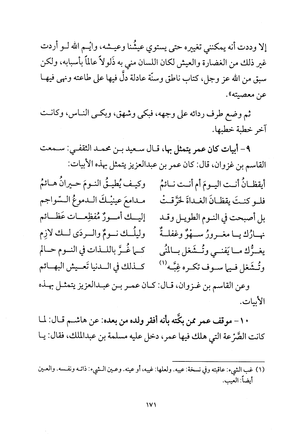 9 - أبيات كان عمر يتمثل بها، قال سعيد بن محمد الثقفي: سمعت القاسم بن عزوان، قال: كان عمر بن عبد العزيز يتمثل بهذه الأبيات: