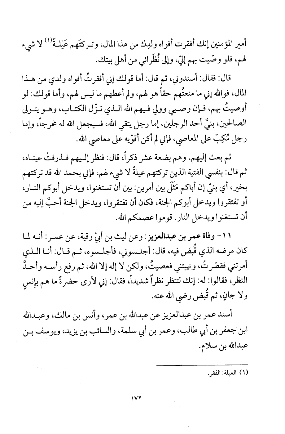 قال: فقال: أسندوني، ثم قال: أما قولك إني أفقرت أفواه ولدي من هذا المال، فو الله إني ما منعتهم حقاً هو لهم، ولم أعطهم ما ليس لهم، وأما قولك: لو أوصيت بهم، فإن وصيي وولي فيهم الله الذي نزّل الكتاب، وهو يتولى الصالحين، بنيَّ أحد الرجلين، إما رجل يتقي الله، فسيجعل الله له مخرجاً، وإما رجل مكبّ على المعاصي، فإني لم أكن أقوّيه على معاصي الله.