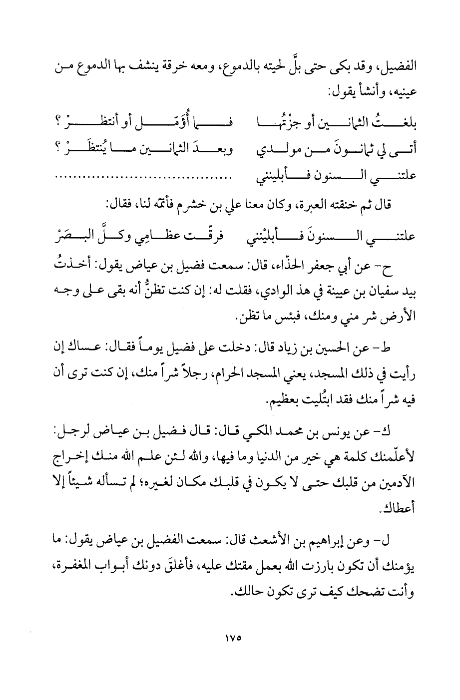 الفضيل، وقد بكى حتى بلَّ لحتيه بالدموع، ومعه خرقة ينشف بها الدموع من عينيه، وأنشأ يقول: