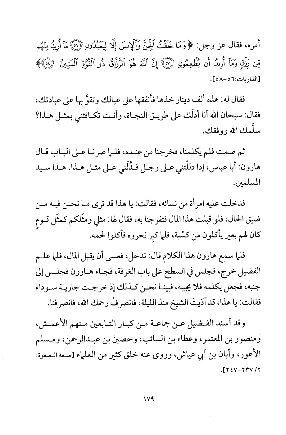 فلما سمع هارون هذا الكلام قال: ندخل، فعسى أن يقبل المال، فلما علم الفضيل خرج، فجلس في السطح على باب الغرفة، فجاء هارون فجلس إلى جنبه، فجعل يكلمه فلا يجيبه، فبينا نحن كذلك إذ خرجت جارية سوداء فقالت: يا هذا، قد آذيت الشيخ منذ الليلة، فانصر فرحمك الله، فانصرفنا.