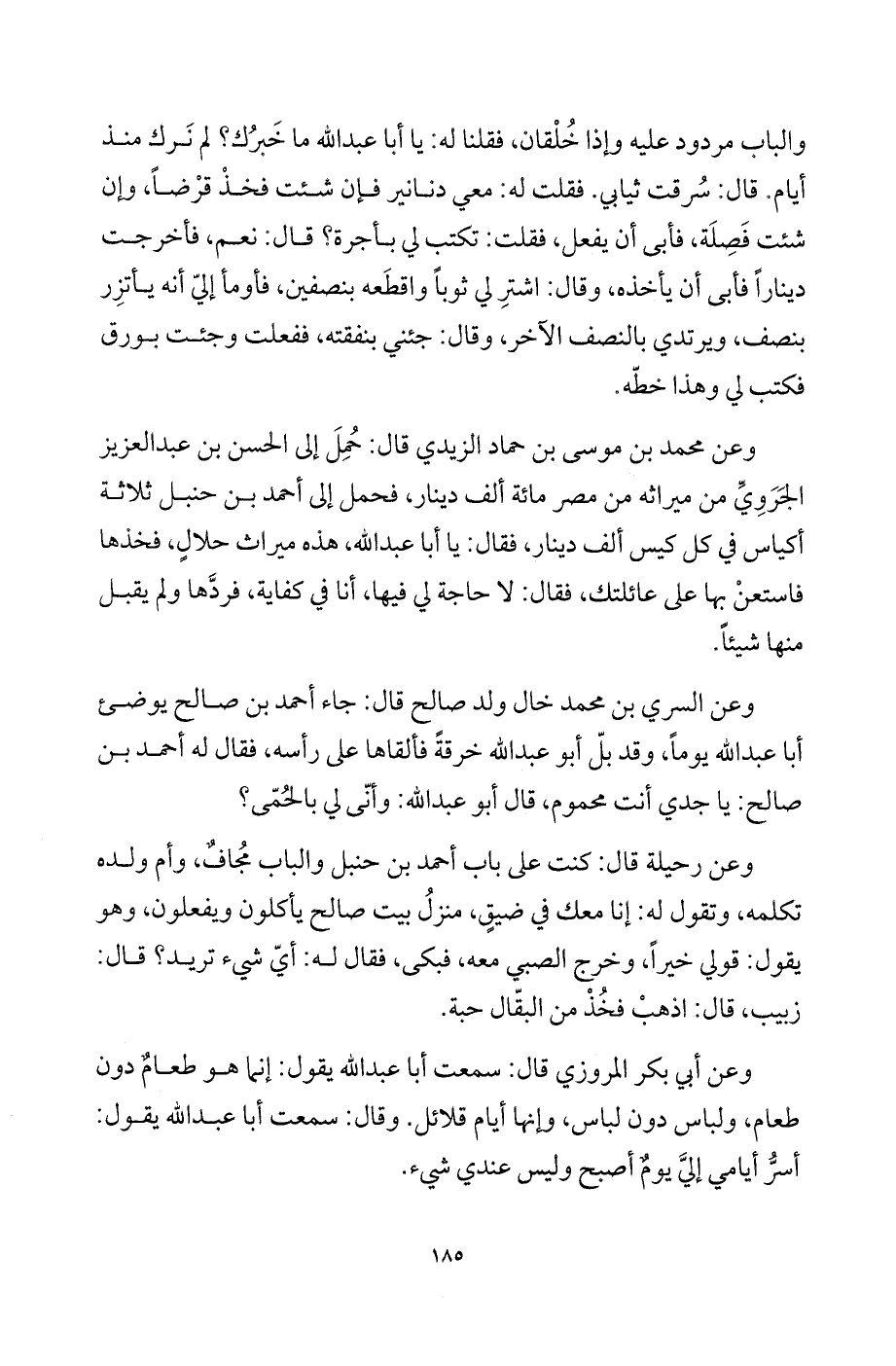وعن رحيلة قال: كنت على باب أحمد بن حنبل والباب مجافٌ، وأم ولده تكلمه، وتقول له: إنا معك في ضيقٍ، منزل بيت صالح يأكلون ويفعلون، وهو يقول: قولي خيراً، وخرج الصبي معه، فبكى، فقال له: أيّ شيء تريد؟ قال: زبيب، قال: اذهب فخذ من البقّال حبة.