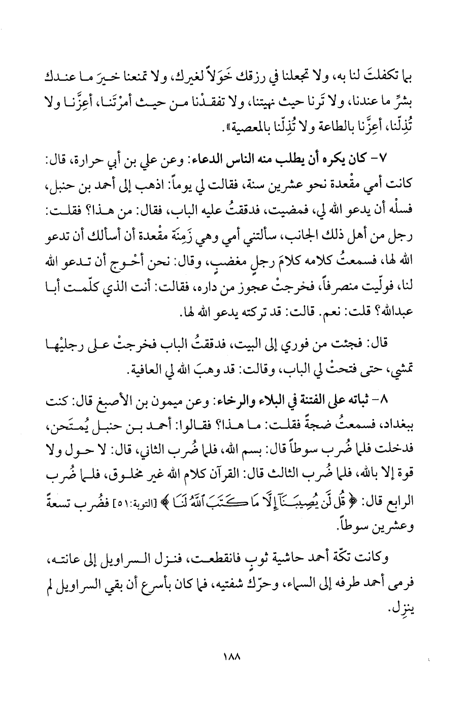 7 - كان يكره أن يطلب منه الناس الدعاء: وعن علي بن أبي حرارة، قال: كانت أمي مقعدة نحو عشرين سنة، فقالت لي يوماً: اذهب إلى أحمد بن حنبل، فسله أن يدعو الله لي، فمضيت، فدققت عليه الباب، فقال: من هذا؟ فقلت: رجل من أهل ذلك الجانب، سألتني أمي وهي زمنة مقعدة أن أسألك أن تدعو الله لها، فسمعت كلامه كلام رجلٍ مغضبٍ، وقال: نحن أحوج أن تدعو الله لنا، فولّيت منصرفاً، فخرجت عجوز من داره، فقالت: أنت الذي كلّمت أبا عبد الله؟ قلت: نعم. قالت: قد تركته يدعو الله لها.