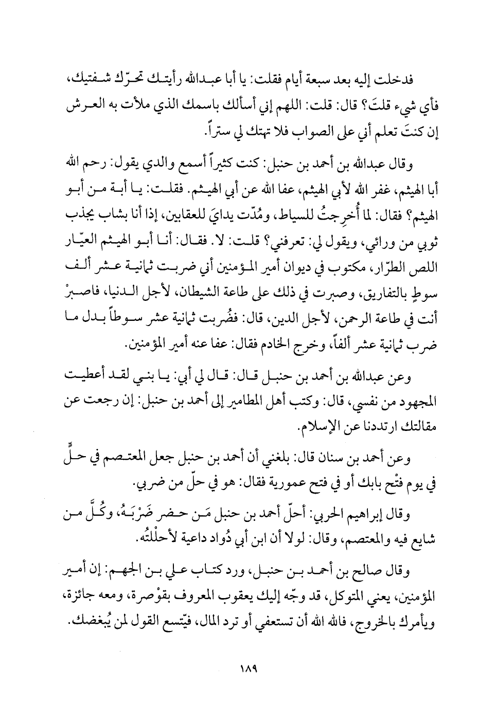 وعن أحمد بن سنان قال: بلغني أن أحمد بن حنبل جعل المعتصم في حلٍّ في يوم فتح بابك أو في فتح عمورية فقال: هو في حلّ من ضربي.
