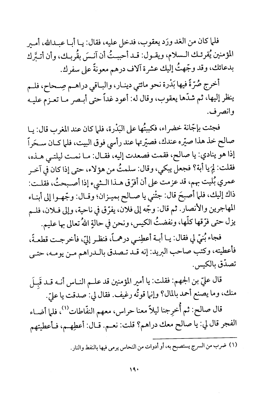 قال صالح: ثم أخرجنا ليلاً معنا حراس، معهم النفّاطات (¬1)، فلما أضاء الفجر قال لي: يا صالح معك دراهم؟ قلت: نعم. قال: أعطهم، فأعطيتهم