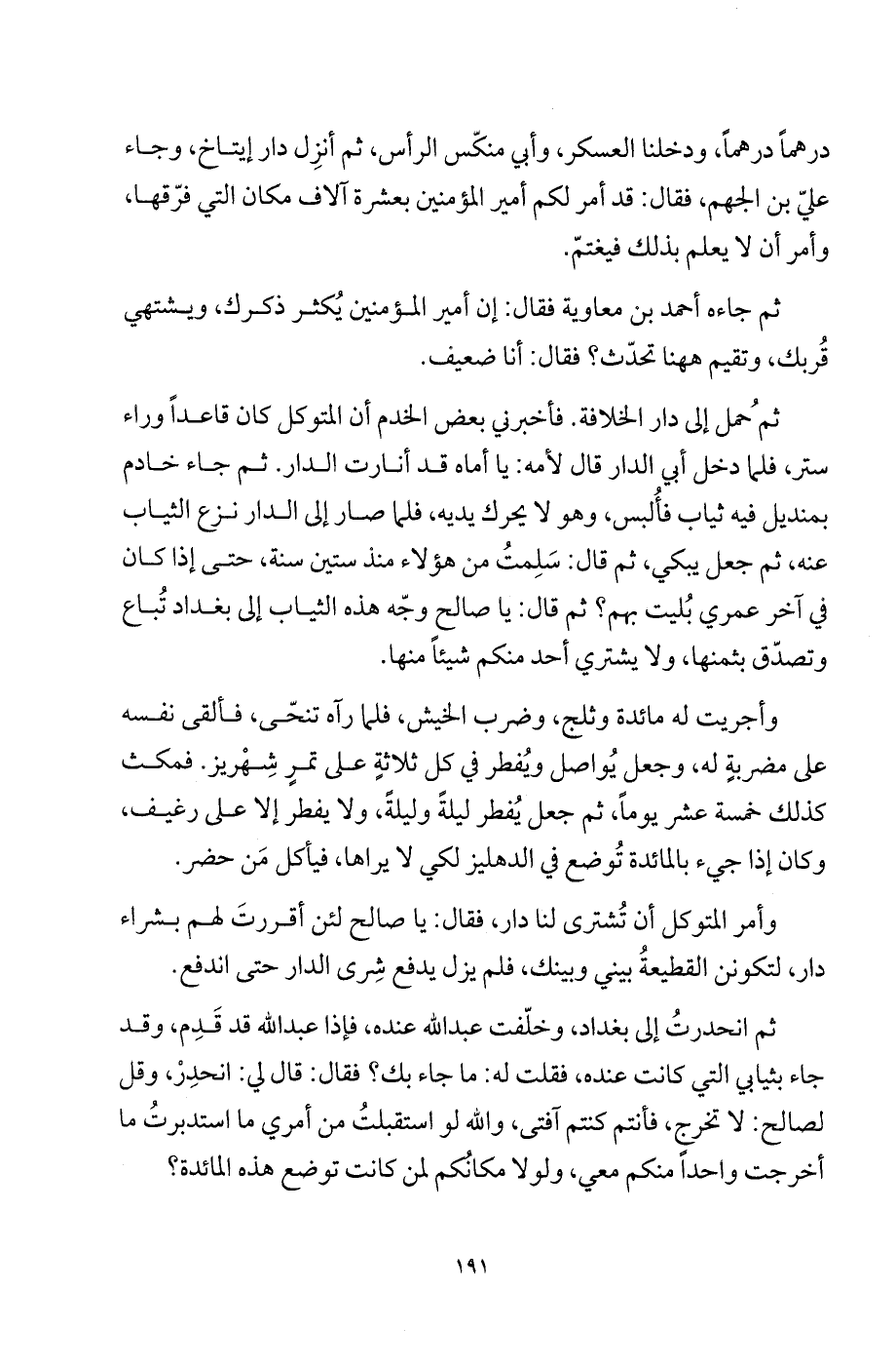 درهماً درهماً، ودخلنا العسكر، وأبي منكّس الرأس، ثم أنزل دار إيتاخ، وجاء عليّ بن الجهم، فقال: قد أمر لكم أمير المؤمنين بعشرة آلاف مكان التي فرّقها، وأمر أن لا يعلم بذلك فيغتمّ.