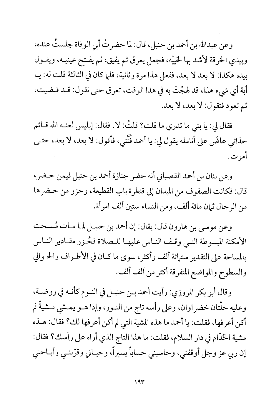 وعن عبد الله بن أحمد بن حنبل، قال: لما حضرت أبي الوفاة جلست عنده، وبيدي الخرقة لأشد بها لحييه، فجعل يعرق ثم يفيق، ثم يفتح عينيه، ويقول ببيده هكذا: لا بعد لا بعد، ففعل هذا مرة وثانية، فلما كان في الثالثة قلت له: يا أبة أي شيء هذا، قد لهجت به في هذا الوقت، تعرق حتى نقول: قد قضيت، ثم تعود فتقول: لا بعد، لا بعد.