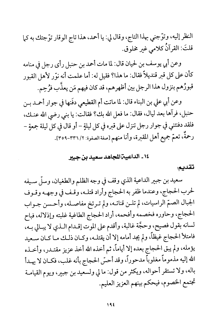 سعيد بن جبير الداعية الذي وقف في وجه الظلم والطغيان، وسلّ سيفه لحرب الحجاج، وعندما ظفر به الحجاج وأراد قتله، وقف في وجهه وقوف الجبال الصمّ الراسيات، لم تلن قناته، ولم ترتخ مفاصله، وأحسن جواب الحجاج، وحاوره فخصمه وأفحمه، أراد الحجاج الطاغية غلبته وإذلاله، فباح لسانه بقول فصيح، وحجَّة غالبة، وأقدم على الموت إقدام الذي لا يبالي به، فامتلأ الحجاج غيظاً، ولم يجد أمامه إلا أن يقتله، وكان ذلك ما كان سعيد يؤمله، ولم يبق الحجاج بعده إلا أياماً، ثم أخذه الله أخذ عزيز مقتدر، وأخذه الله إليه مذموماً مغلوباً مدحوراً، وقد أحسّ الحجاج بأنه غلب، فكان لا يهدأ باله، ولا تستقر أحواله ويكثر من قول: ما لي ولسعيد بن جبير، ويوم القيامة تجتمع الخصوم، فيحكم بينهم العزيز العليم.