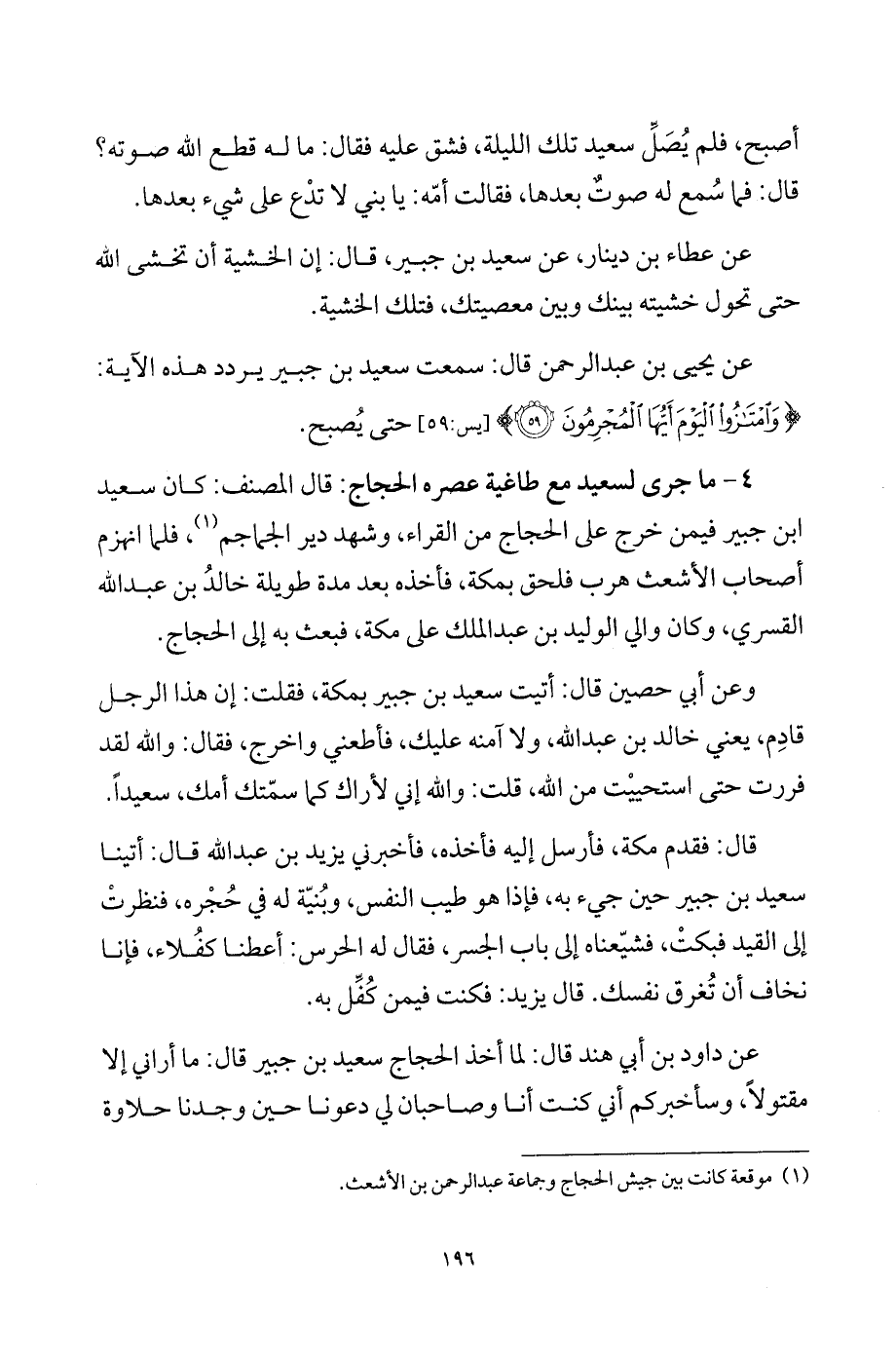 4 - ما جرى لسعيد مع طاغية عصره الحجاج: قال المصنف: كان سعيد ابن جبير فيمن خرج على الحجاج من القراء، وشهد دير الجماجم (¬1)، فلما انهزم أصحاب الأشعث هرب فلحق بمكة، فأخذه بعد مدة طويلة خالد بن عبد الله القسري، وكان والي الوليد بن عبد الملك على مكة، فبعث به إلى الحجاج.