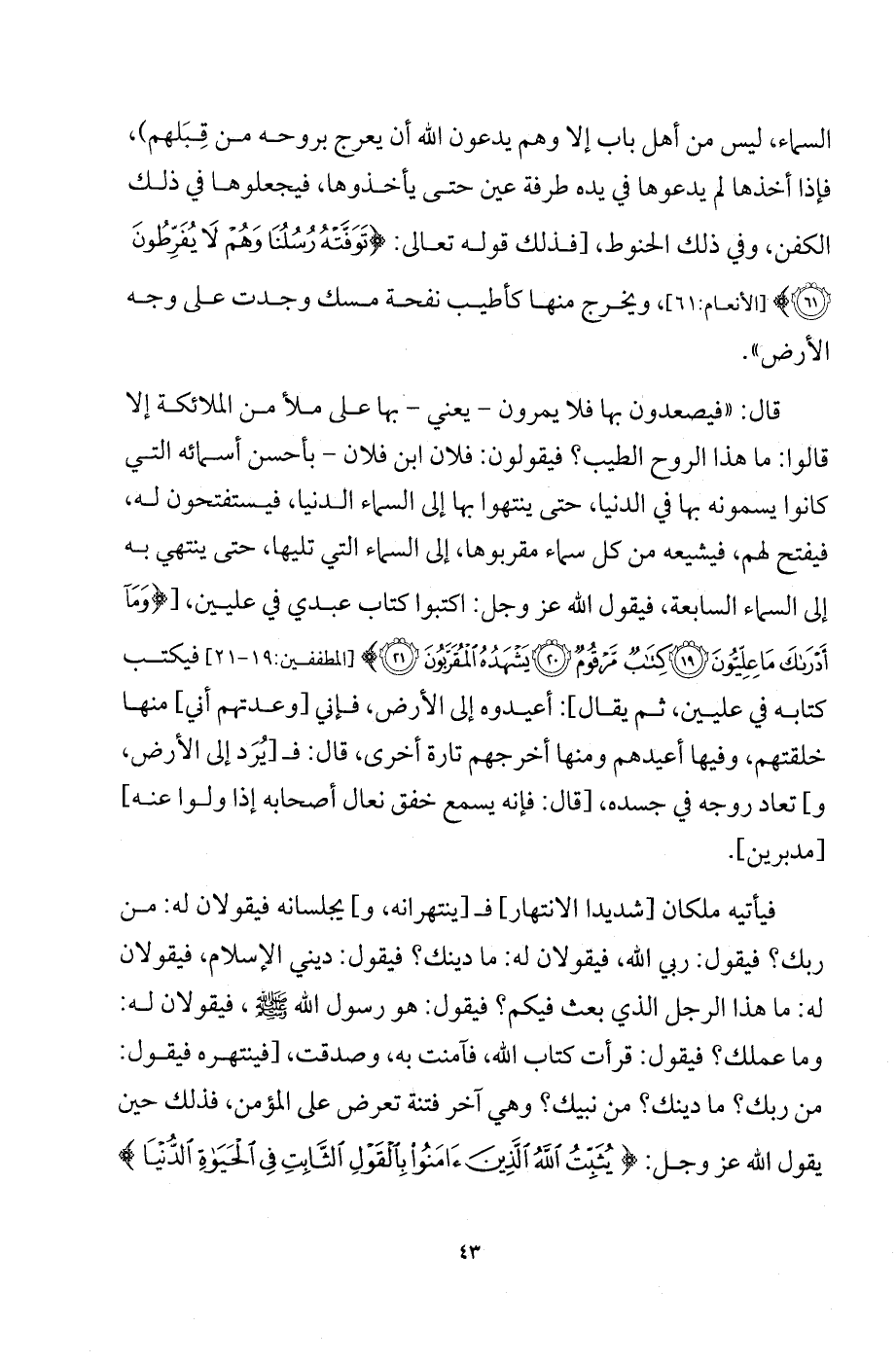 قال: «فيصعدون بها فلا يمرون - يعني - بها على ملأ من الملائكة إلا قالوا: ما هذا الروح الطيب؟ فيقولون: فلان ابن فلان - بأحسن أسمائه التي كانوا يسمونه بها في الدنيا، حتى ينتهوا بها إلى السماء الدنيا، فيستفتحون له، فيفتح لهم، فيشيعه من كل سماء مقربوها، إلى السماء التي تليها، حتى ينتهي به إلى السماء السابعة، فيقول الله عز وجل: اكتبوا كتاب عبدي في عليين، [{وَمَا أَدْرَاكَ مَا عِلِّيُّونَ * كِتَابٌ مَّرْقُومٌ * يَشْهَدُهُ الْمُقَرَّبُونَ} [المطففين: 19 - 21] فيكتب كتابه في عليين، ثم يقال]: أعيدوه إلى الأرض، فإني [وعدتهم أني] منها خلقتهم، وفيها أعيدهم ومنها أخرجهم تارة أخرى، قال: فـ[يرد إلى الأرض، و] تعاد روحه في جسده، [قال: فإنه يسمع خفق نعال أصحابه إذا ولوا عنه] [مدبرين].