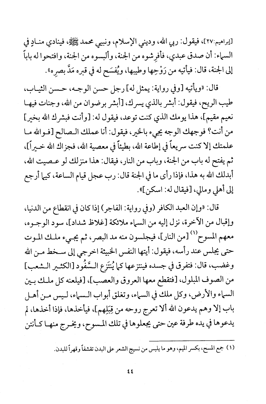 قال: «وإن العبد الكافر (وفي رواية: الفاجر) إذا كان في انقطاع من الدنيا، وإقبال من الآخرة، نزل إليه من السماء ملائكة [غلاظ شداد]، سود الوجوه، معهم المسوح (¬1) [من النار]، فيجلسون منه مد البصر، ثم يجيء ملك الموت حتى يجلس عند رأسه، فيقول: أيتها النفس الخبيئة اخرجي إلى سخط من الله وغضب، قال: فتفرق في جسده فينتزعها كما ينتزع السَّفود [الكثير الشعب] من الصوف المبلول، [فتقطع معها العروق والعصب]، [فيلعنه كل ملك بين السماء والأرض، وكل ملك في السماء، وتغلق أبواب السماء، ليس من أهل باب إلا وهم يدعون الله ألا تعرج روحه من قبلهم]، فيأخذهما، فإذا أخذها، لم يدعوها في يده طرفة عين حتى يجعلوها في تلك المسوح، ويخرج منها كأنتن