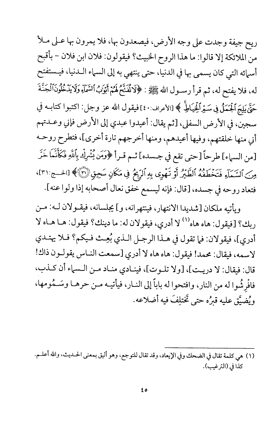 ريح جيفه وجدت على وجه الأرض، فيصعدون بها، فلا يمرون بها على ملأ من الملائكة إلا قالوا: ما هذا الروح الخبيث؟ فيقولون: فلان ابن فلان - بأقبح أسمائه التي كان يسمى بها في الدنيا، حتى ينتهي به إلى السماء الدنيا، فيستفتح له، فلا يفتح له، ثم قرأ رسول الله - صلى الله عليه وسلم -: {لا تُفَتَّحُ لَهُمْ أَبْوَابُ السَّمَاءِ وَلا يَدْخُلُونَ الْجَنَّةَ حَتَّى يَلِجَ الْجَمَلُ فِي سَمِّ الْخِيَاطِ} [الأعراف: 40] فيقول الله عز وجل: اكتبوا كتابه في سجين، في الأرض السفلى، [ثم يقال: أعيدوا عبدي إلى الأرض فإني وعدتهم أني منها خلقتهم، وفيها أعيدها، ومنها أخرجهم تارة أخرى]، فتطرح روحه [من السماء] طرحاً [حتى تقع في جسده] ثم قرأ {وَمَنْ يُشْرِكْ بِاللَّهِ فَكَأَنَّمَا خَرَّ مِنْ السَّمَاءِ فَتَخْطَفُهُ الطَّيْرُ أَوْ تَهْوِي بِهِ الرِّيحُ فِي مَكَانٍ سَحِيقٍ} [الحج:31]، فتعاد روحه في جسده، [قال: فإنه ليسمع خفق نعال أصحابه إذا ولوا عنه].