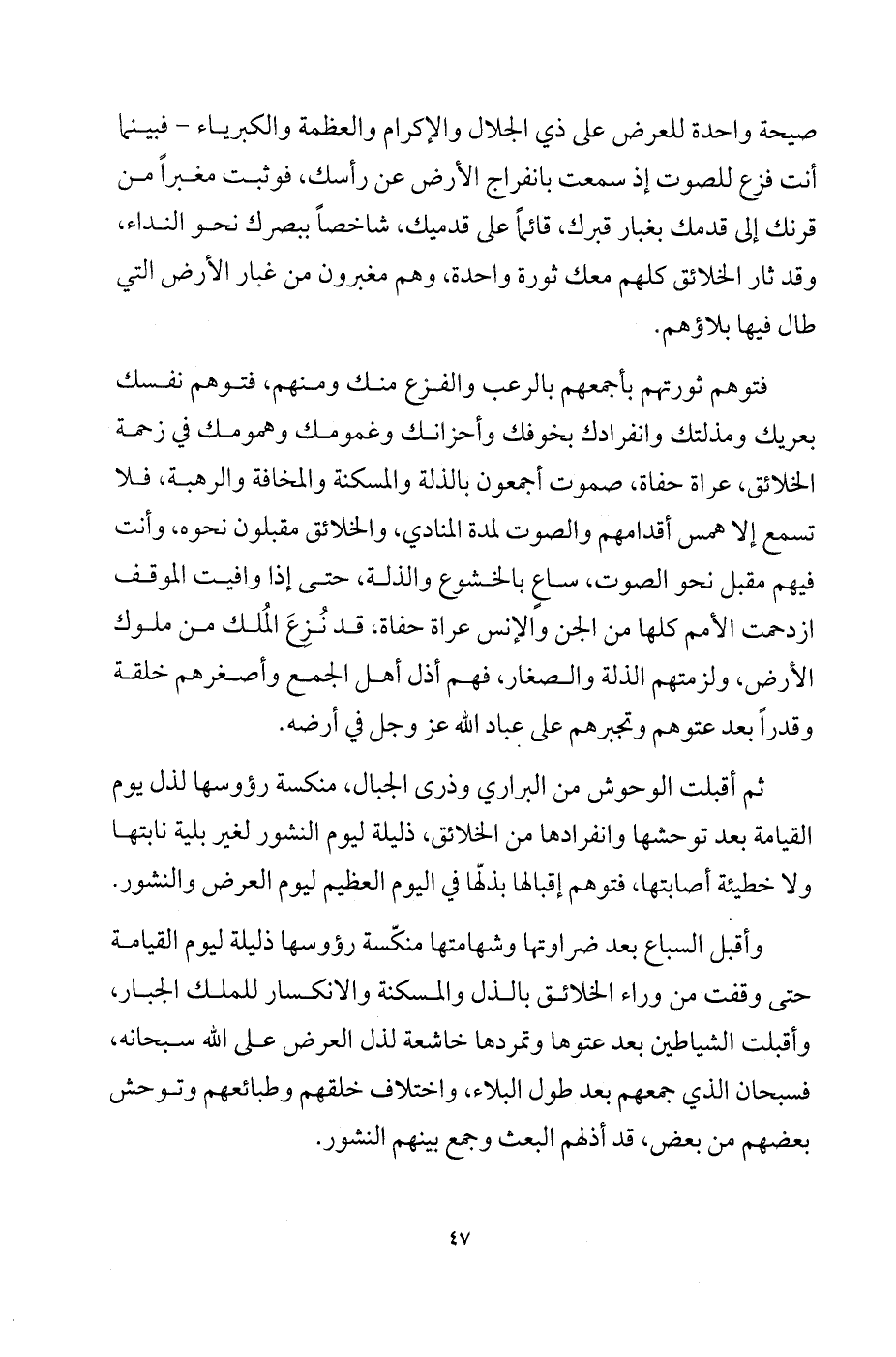 صيحة واحدة للعرض على ذي الجلال والإكرام والعظمة والكبرياء - فبينما أنت فزع للصوت إذ سمعت بانفراج الأرض عن رأسك، فوثبت مغيراً من قرنك إلى قدمك بغبار قبرك، قائماً على قدميك، شاخصاً ببصرك نحو النداء، وقد ثار الخلائق كلهم معك ثورة واحدة، وهم مغبرون من غبار الأرض التي طال فيها بلاؤهم.