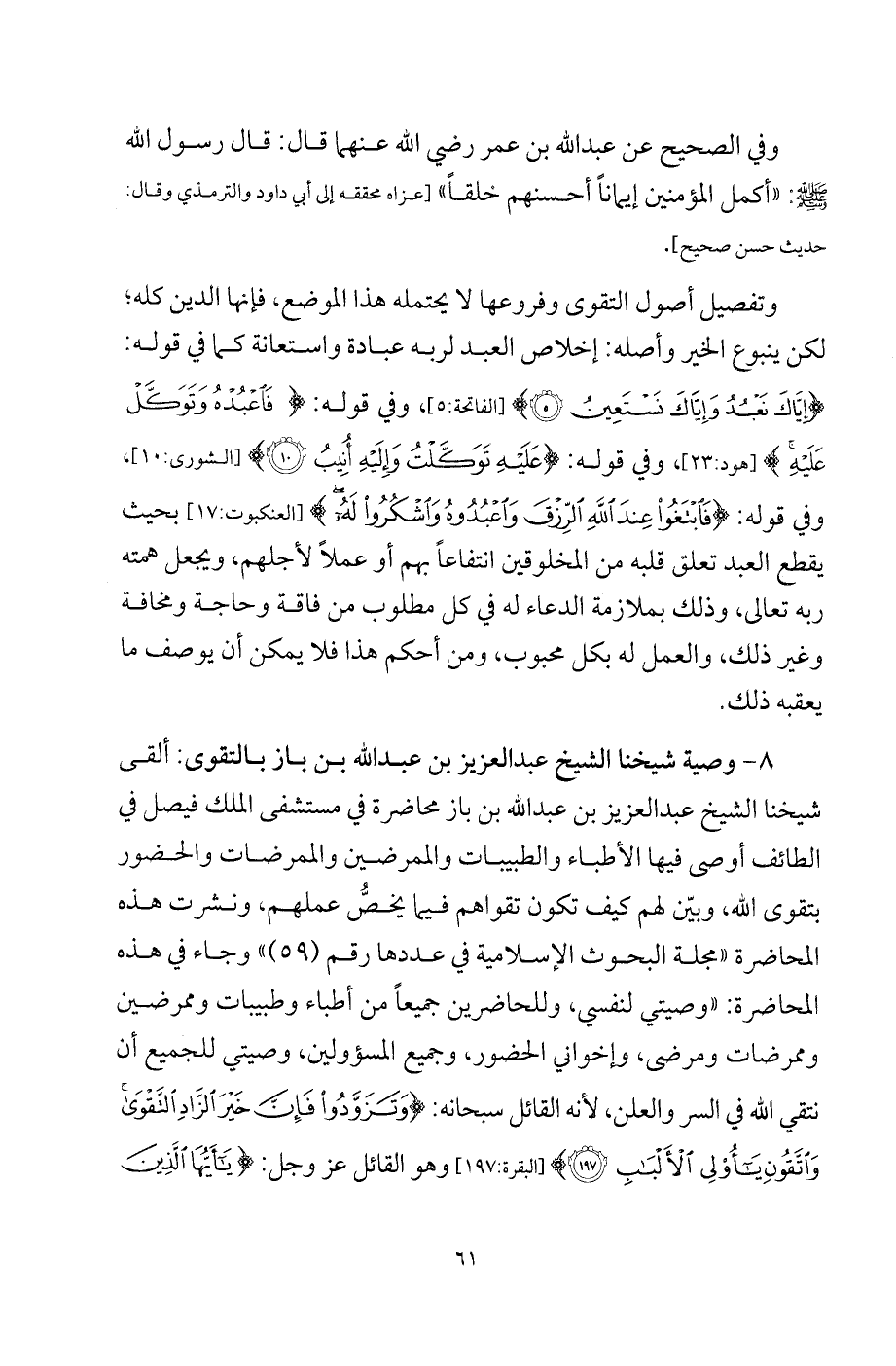 8 - وصية شيخنا الشيخ عبد العزيز بن عبد الله بن باز بالتقوى: ألقى شيخنا الشيخ عبد العزيز بن عبد الله بن باز محاضرة في مستشفى الملك فيصل في الطائف أوصى فيها الأطباء والطبيبات والممرضين والممرضات والحضور بتقوى الله، وبيّن لهم كيف تكون تقواهم فيما يخصُّ عملهم، ونشرت هذه المحاضرة "مجلة البحوث الإسلامية في عددها رقم (59) " وجاء في هذه المحاضرة: "وصيتي لنفسي، وللحاضرين جميعاً من أطباء وطبيبات وممرضين وممرضات ومرضى، وإخواني الحضور، وجميع المسؤولين، وصيتي للجميع أن نتقي الله في السر والعلن، لأنه القائل سبحانه: {وَتَزَوَّدُوا فَإِنَّ خَيْرَ الزَّادِ التَّقْوَى وَاتَّقُونِ يَا أُوْلِي الأَلْبَابِ} [البقرة: 197] وهو القائل عز وجل: {يَا أَيُّهَا الَّذِينَ