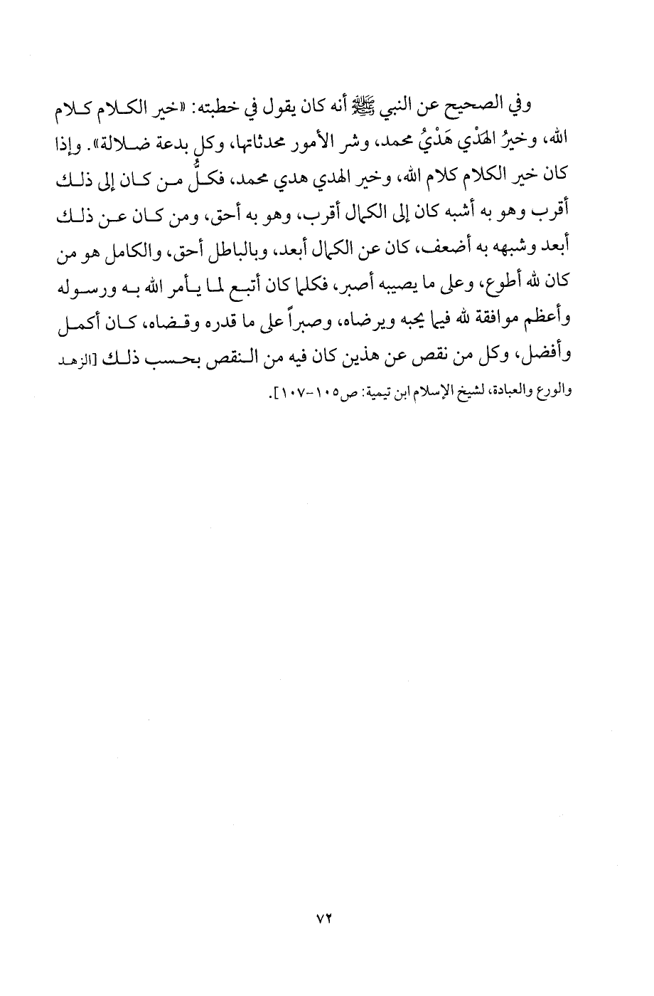 وفي الصحيح عن النبي - صلى الله عليه وسلم - أنه كان يقول في خطبته: «خير الكلام كلام الله، وخير الهدي هدي محمد، وشر الأمور محدثاتها، وكل بدعة ضلالة». وإذا كان خير الكلام كلام الله، وخير الهدي هدي محمد، فكلُّ من كان إلى ذلك أقرب وهو به أشبه كان إلى الكمال أقرب، وهو به أحق، ومن كان عن ذلك أبعد وشبهه به أضعف، كان عن الكمال أبعد، وبالباطل أحق، والكامل هو من كان لله أطوع، وعلى ما يصيبه أصبر، فكلما كان أتبع لما يأمر الله به ورسوله وأعظم موافقة لله فيما يحبه ويرضاه، وصبراً على ما قدره وقضاه، كان أكمل وأفضل، وكل من نقص عن هذين كان فيه من النقص بحسب ذلك [الزهد والورع والعبادة، لشيخ الإسلام ابن تيمية: ص 150 - 107].