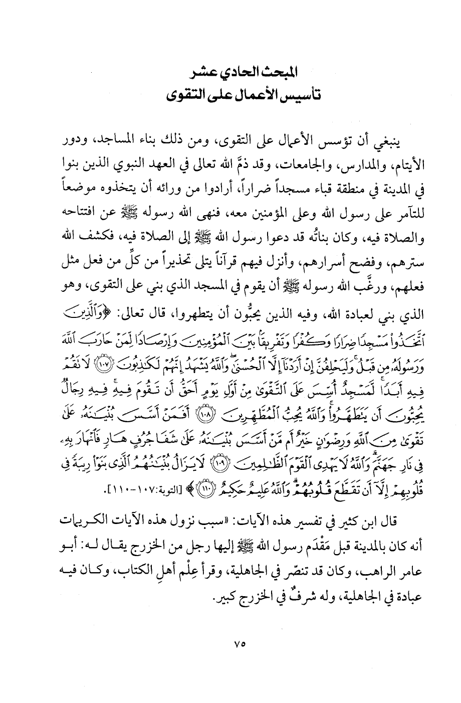 ينبغي أن تؤسس الأعمال على التقوى، ومن ذلك بناء المساجد، ودور الأيتام، والمدارس، والجامعات، وقد ذمَّ الله تعالى في العهد النبوي الذين بنوا في المدينة في منطقة قباء مسجداً ضراراً، أرادوا من ورائه أن يتخذوه موضعاً للتآمر على رسول الله وعلى المؤمنين معه، فنهى الله رسوله - صلى الله عليه وسلم - عن افتتاحه والصلاة فيه، وكان بناته قد دعوا رسول الله - صلى الله عليه وسلم - إلى الصلاة فيه، فكشف الله سترهم، فضح أسرارهم، وأنزل فيهم قرآناً يتلى تحذيراً من كلِّ من فعل مثل فعلهم، ورغَّب الله رسوله - صلى الله عليه وسلم - أن يقوم في المسجد الذي بني على التقوى، وهو الذي بني لعبادة الله، وفيه الذين يحبُّون أن يتظهروا، قال تعالى: {وَالَّذِينَ اتَّخَذُوا مَسْجِدًا ضِرَارًا وَكُفْرًا وَتَفْرِيقًا بَيْنَ الْمُؤْمِنِينَ وَإِرْصَادًا لِّمَنْ حَارَبَ اللَّهَ وَرَسُولَهُ مِنْ قَبْلُ وَلَيَحْلِفُنَّ إِنْ أَرَدْنَا إِلَّا الْحُسْنَى وَاللَّهُ يَشْهَدُ إِنَّهُمْ لَكَاذِبُونَ * لا تَقُمْ فِيهِ أَبَدًا لَّمَسْجِدٌ أُسِّسَ عَلَى التَّقْوَى مِنْ أَوَّلِ يَوْمٍ أَحَقُّ أَنْ تَقُومَ فِيهِ فِيهِ رِجَالٌ يُحِبُّونَ أَنْ يَتَطَهَّرُوا وَاللَّهُ يُحِبُّ الْمُطَّهِّرِينَ * أَفَمَنْ أَسَّسَ بُنْيَانَهُ عَلَى تَقْوَى مِنْ اللَّهِ وَرِضْوَانٍ خَيْرُ أَمْ مَّنْ أَسَّسَ بُنْيَانَهُ عَلَى شَفَا جُرُفٍ هَارٍ فَانْهَارَ بِهِ فِي نَارِ جَهَنَّمَ وَاللَّهُ لا يَهْدِي الْقَوْمَ الظَّالِمِينَ * لا يَزَالُ بُنْيَانُهُمْ الَّذِي بَنَوْا رِيبَةً فِي قُلُوبِهِمْ إِلَّا أَنْ تَقَطَّعَ قُلُوبُهُمْ وَاللَّهُ عَلِيمُ حَكِيمُ} [التوبة: 107 - 110].