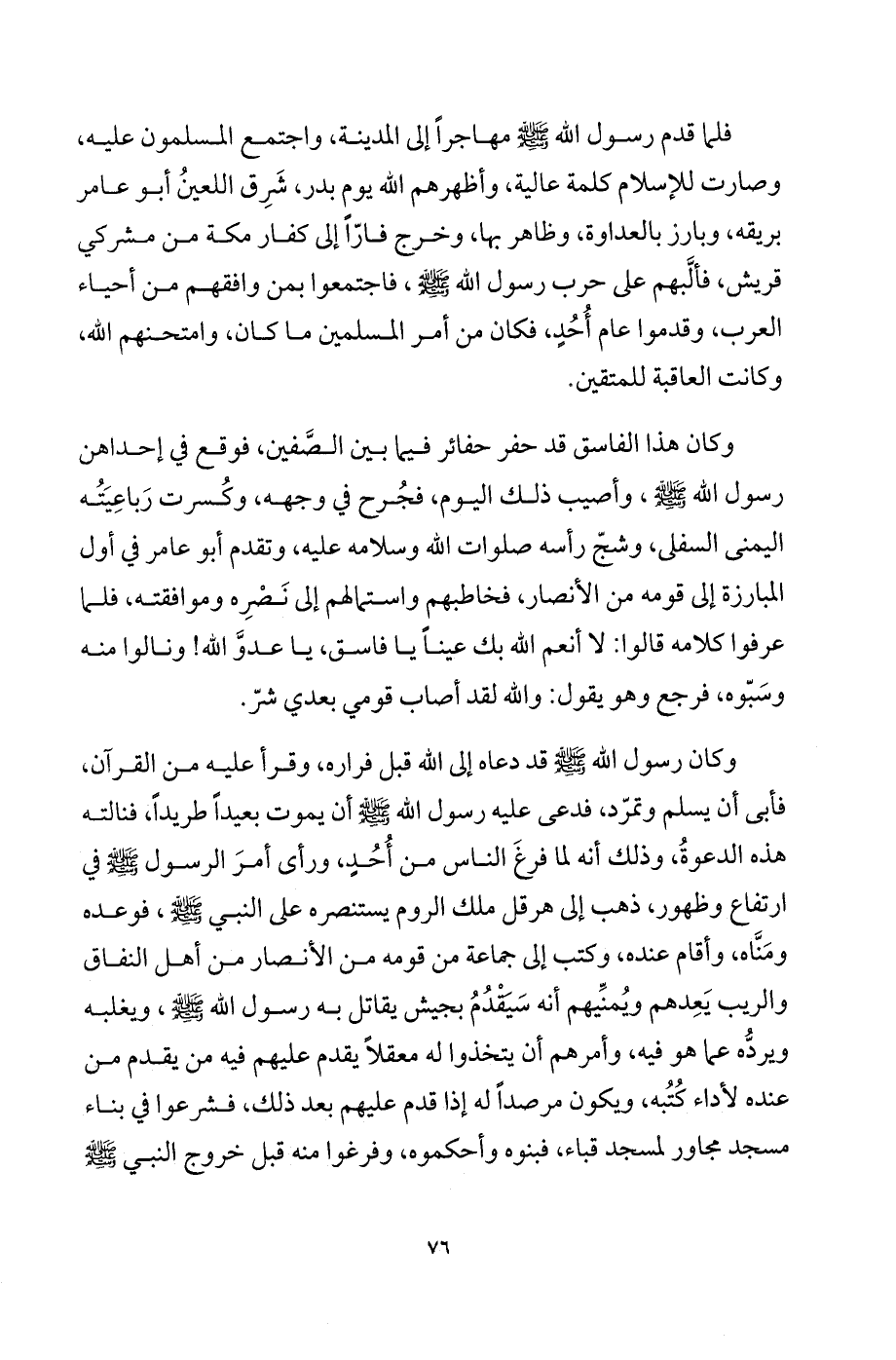 فلما قدم رسول الله - صلى الله عليه وسلم - مهاجراً إلى المدينة، واجتمع المسلمون عليه، وصارت للإسلام كلمة عالية، واظهرهم الله يوم بدر، شرق اللعين أبو عامر بريقه، وبارز بالعداوة، وظاهر بها، وخرج فارّاً إلى كفار مكة من مشركي قريش، فألَّبهم على حرب رسول الله - صلى الله عليه وسلم -، فاجتمعوا بمن وافقهم من أحياء العرب، وقدموا عام أحدٍ، فكان من أمر المسلمين ما كان، وامتحنهم الله، وكانت العاقبة للمتقين.