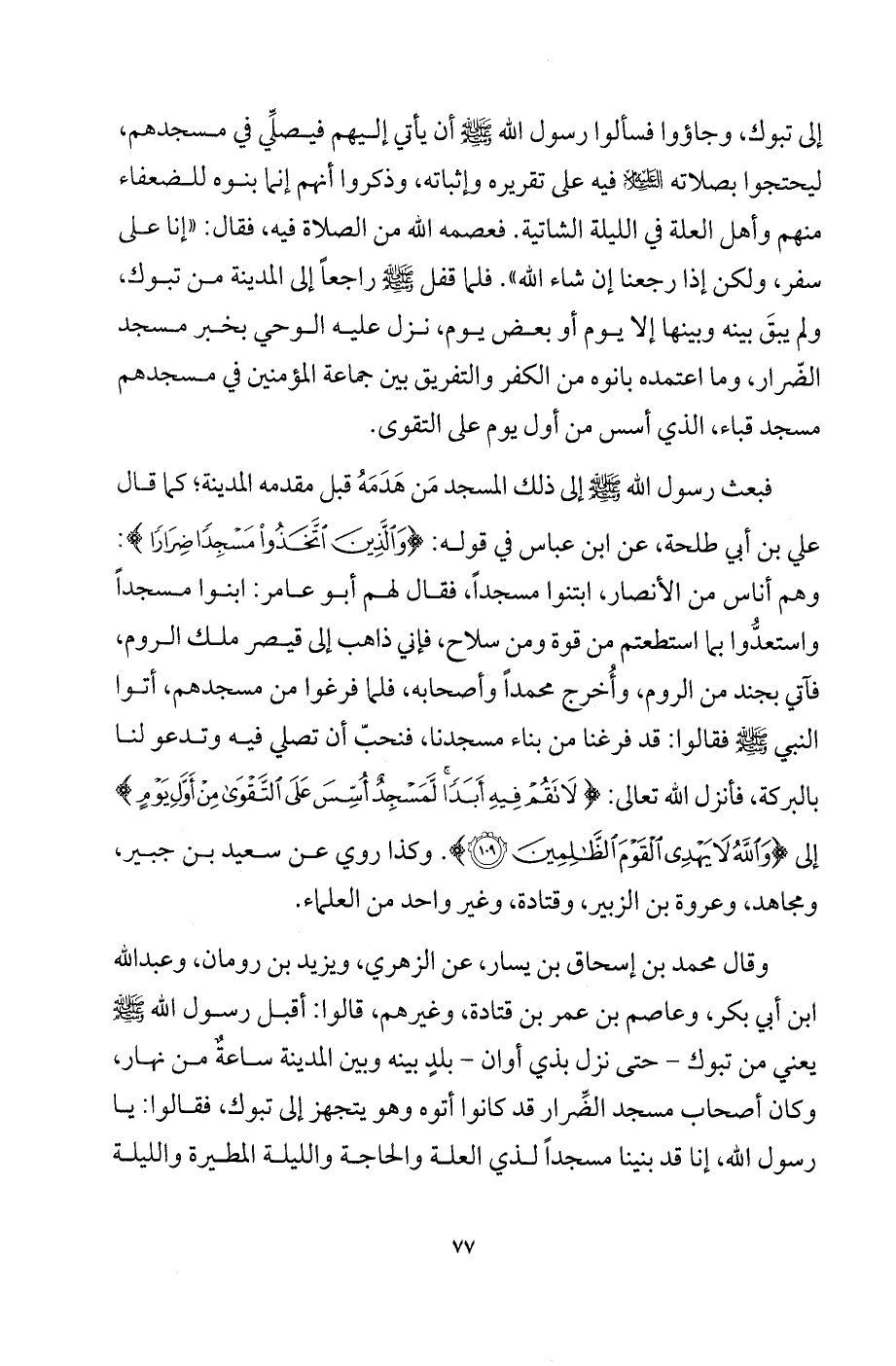 إلى تبوك، وجاؤوا فسألوا رسول الله - صلى الله عليه وسلم - أن يأتي إليهم فيصلِّي في مسجدهم، ليحتجوا بصلاته عليه السلام فيه على تقريره وإثباته، وذكروا أنهم إنما بنوه للضعفاء منهم وأهل العلة في الليلة الشاتية. فعصمه الله من الصلاة فيه، فقال: «إنا على سفر، ولكن إذا رجعنا إن شاء الله». فلما قفل - صلى الله عليه وسلم - راجعاً إلى المدينة من تبوك، ولم يبق بينه وبينها إلا يوم أو بعض يوم، نزل عليه الوحي بخبر مسجد الضّرار، وما اعتمده بانوه من الكفر والتفريق بين جماعة المؤمنين في مسجدهم مسجد قباء، الذي أسس من أول يوم على التقوى.