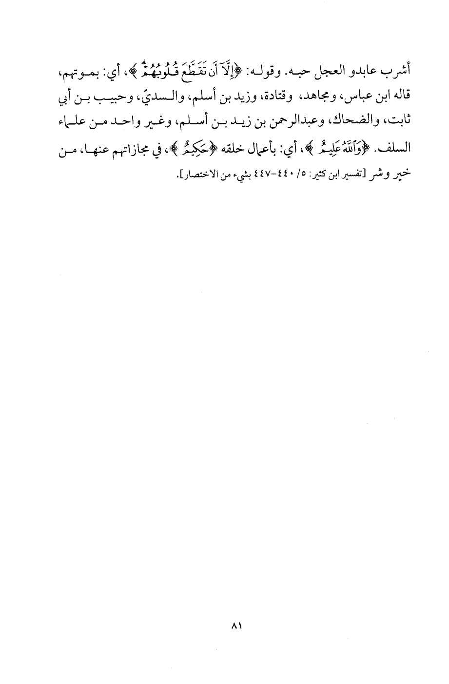 أشرب عابدو العجل حبه. وقوله: {إِلَّا أَنْ تَقَطَّعَ قُلُوبُهُمْ}، أي: بموتهم، قاله ابن عباس، ومجاهد، وقتادة، وزيد بن أسلم، والسديّ، وحبيب بن أبي ثابت، والضحاك، وعبد الرحمن بن زيد بن أسلم، وغير واحد من علماء السلف. {وَاللَّهُ عَلِيمُ}، أي: بأعمال خلقه {حَكِيمُ}، في مجازاتهم عنها، من خير وشر [تفسير ابن كثير: 5/ 440 - 447 بشيء من الاختصار].