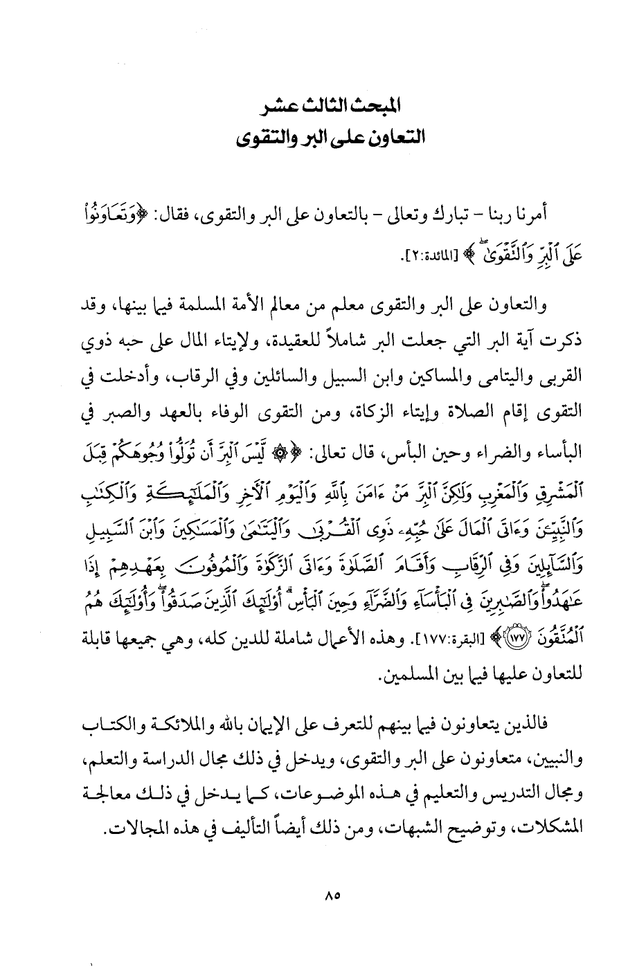 والتعاون على البر والتقوى معلم من معالم الأمة المسلمة فيما بينها، وقد ذكرت آية البر التي جعلت البر شاملاً للعقيدة، ولإيتاء المال على حبه ذوي القربى واليتامى والمساكين وابن السبيل والسائلين وفي الرقاب، وأدخلت في التقوى إقام الصلاة وإيتاء الزكاة، ومن التقوى الوفاء بالعهد والصبر في البأساء والضراء وحين البأس، قال تعالى: {لَّيْسَ الْبِرَّ أَنْ تُوَلُّوا وُجُوهَكُمْ قِبَلَ الْمَشْرِقِ وَالْمَغْرِبِ وَلَكِنَّ الْبِرَّ مَنْ آمَنَ بِاللَّهِ وَالْيَوْمِ الْآخِرِ وَالْمَلَائِكَةِ وَالْكِتَابِ وَالنَّبِيِّينَ وَآتَى الْمَالَ عَلَى حُبِّهِ ذَوِي الْقُرْبَى وَالْيَتَامَى وَالْمَسَاكِينَ وَابْنَ السَّبِيلِ وَالسَّائِلِينَ وَفِي الرِّقَابِ وَأَقَامَ الصَّلَاةَ وَآتَى الزَّكَاةَ وَالْمُوفُونَ بِعَهْدِهِمْ إِذَا عَاهَدُوا وَالصَّابِرِينَ فِي الْبَاسَاءِ وَالضَّرَّاءِ وَحِينَ الْبَاسِ أُولَئِكَ الَّذِينَ صَدَقُوا وَأُولَئِكَ هُمُ الْمُتَّقُونَ} [البقرة: 177]. وهذه الأعمال شاملة للدين كله، وهي جميعها قابلة للتعاون عليها فيما بين المسلمين.