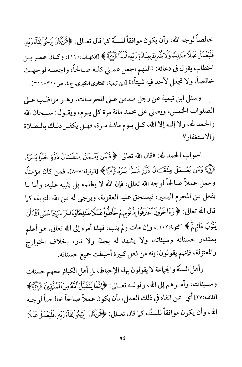 وسُئل ابن تيمية عن رجل مدمن على المحرمات، وهو مواظب على الصلوات الخمس، ويصلي على محمد مائة مرة كل يوم، ويقول: سبحان الله والحمد لله، ولا إله إلا الله، كل يوم مائة مرة، فهل يكفر ذلك بالصلاة والاستغفار؟